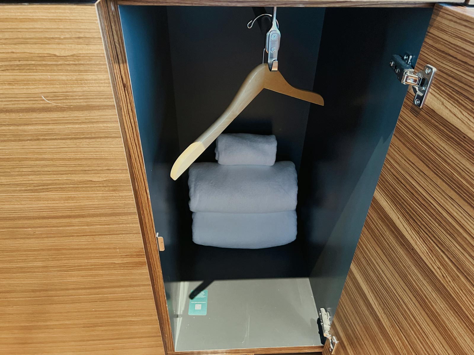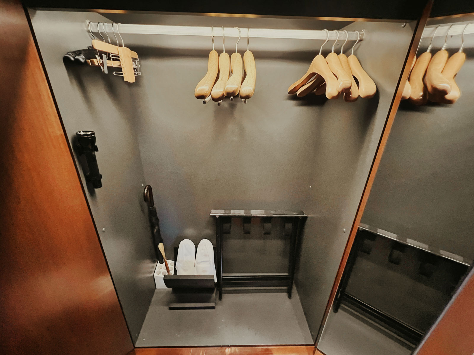 Eine Besonderheit, die zum traditionellen Stil des Hotels hervorragend passt, ist der Schrank Valet Service. Hier könnt ihr eure zu reinigenden Kleider reinlegen bzw. hängen, das Zimmer verlassen, und den Valet-Button im Eingangsbereich drücken. Daraufhin werden die Kleider zur Reinigung abgeholt und anschließend auch wieder hier platziert, unabhängig davon, ob ihr im Zimmer seid oder nicht. Wenn es bloß nicht so teuer wäre ;). Natürlich gibt es auch noch einen regulären Kleiderschrank direkt daneben.