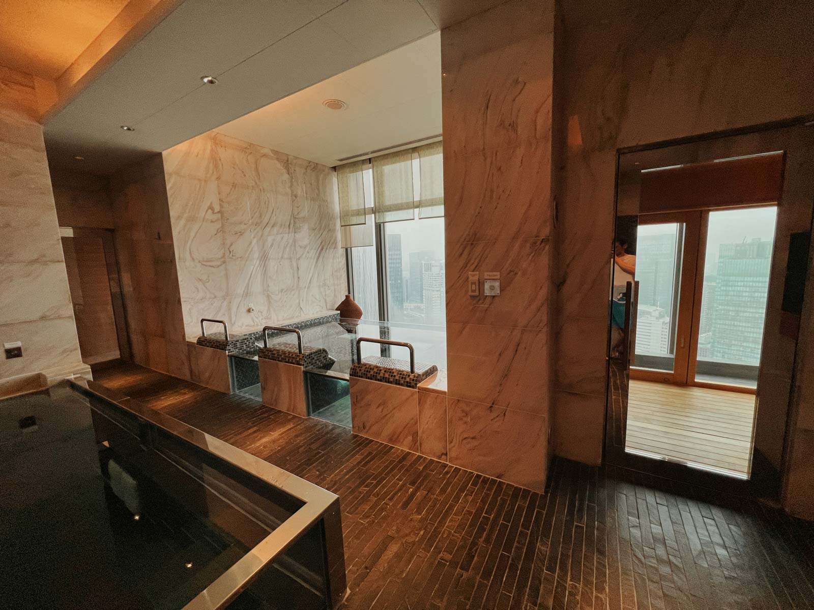 Hier gab es dann zwei warme Sprudelbecken – eines mit Aussicht und ein paar Liegen, das andere mit einer Bank gegenüber – sowie eine Sauna mit einer der Wohl besten Aussichten, die eine Sauna haben kann. Hier ließ es sich gut aushalten, zumal ich die ganze Zeit über den Bereich für mich allein hatte.
