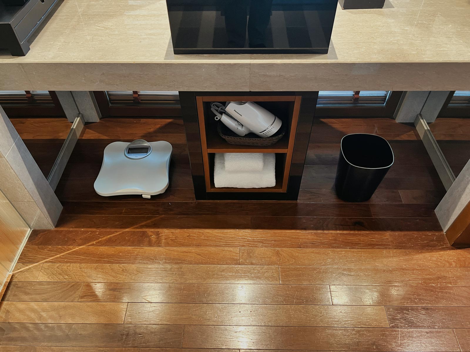 Hinter dem Waschbecken gibt es einen Spiegel auf Schienen welcher nach links oder rechts geschoben werden kann, so dass man freien Blick ins Zimmer und die dahinter liegende Skyline hat. Links auf dem Waschtisch gibt es verschiedenste Amenities wie einen Kamm, Zahnbürste oder Lotion; darunter ist eine Waage, ein Mülleimer sowie ein Föhn und Handtücher zu finden.