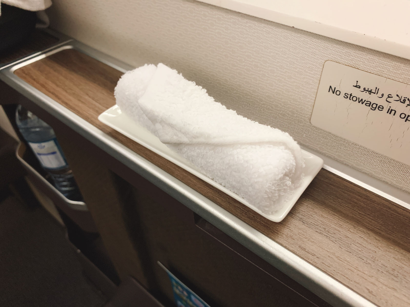 Gebordet wurde lediglich über Türe 2L, wobei es links in die Business Class und rechts in die kleinere Business Class bzw. Economy Class geht, eine Premium Economy Class gibt es bei Oman Air nicht. Wir wurden von zwei freundlichen Flugbegleiterinnen empfangen, und kaum hatten wir uns einigermaßen eingerichtet ging es los mit einem kalten Champagner und einem warmen Tuch sowie einem arabischen Kaffee mit süßer Feige. Da sich der Pushback etwas verzögerte, gab es noch am Gate einen Saft und ein zweites Glas Champagner ohne Nachfrage.