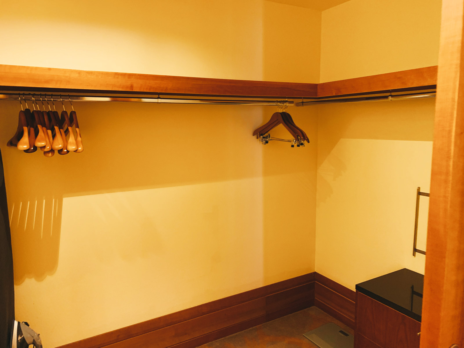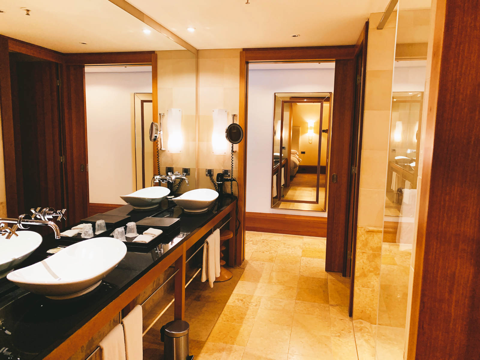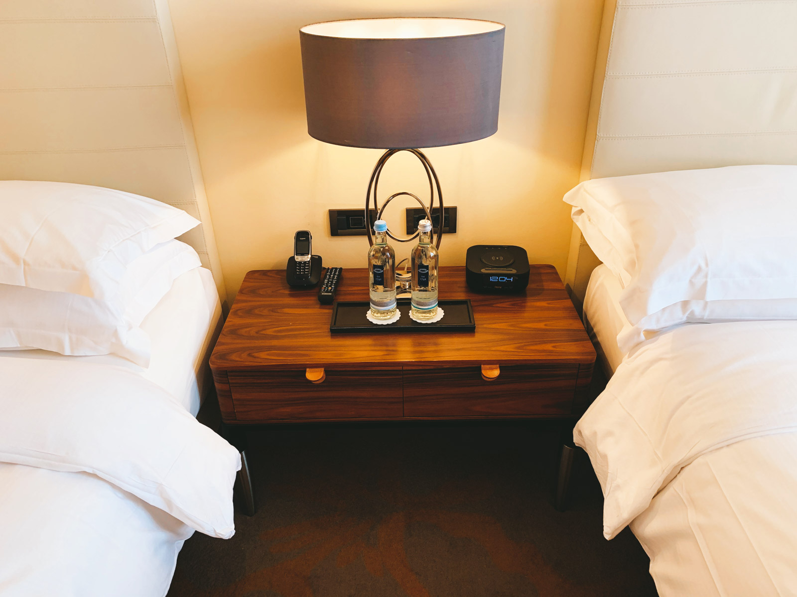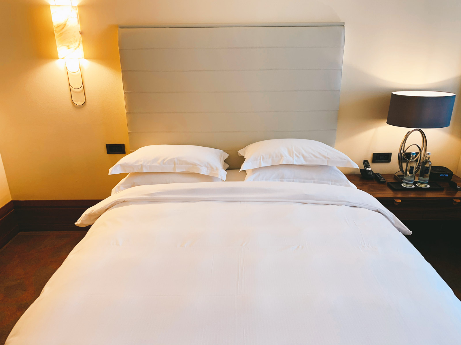 Vom Wohnzimmer führt eine Schiebetür ins Schlafzimmer in welchem sich die zwei Queen-Betten, ein weiterer Fernseher, sowie ein gigantischer begehbarer Schrank befindet. Auf dem Nachttisch standen zudem zwei Wasserflaschen bereit. Auch wenn das Gelb der Wände nicht gerade Modernität vermittelt, so stört es beim Schlafen keinesfalls – die Betten sind hervorragend!