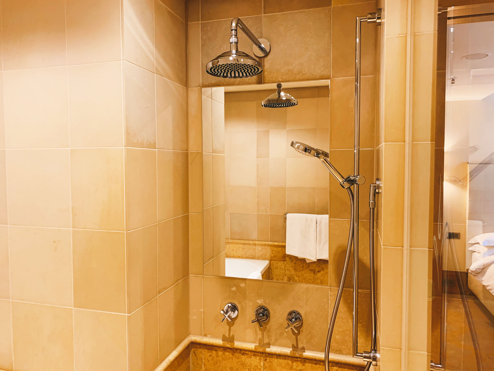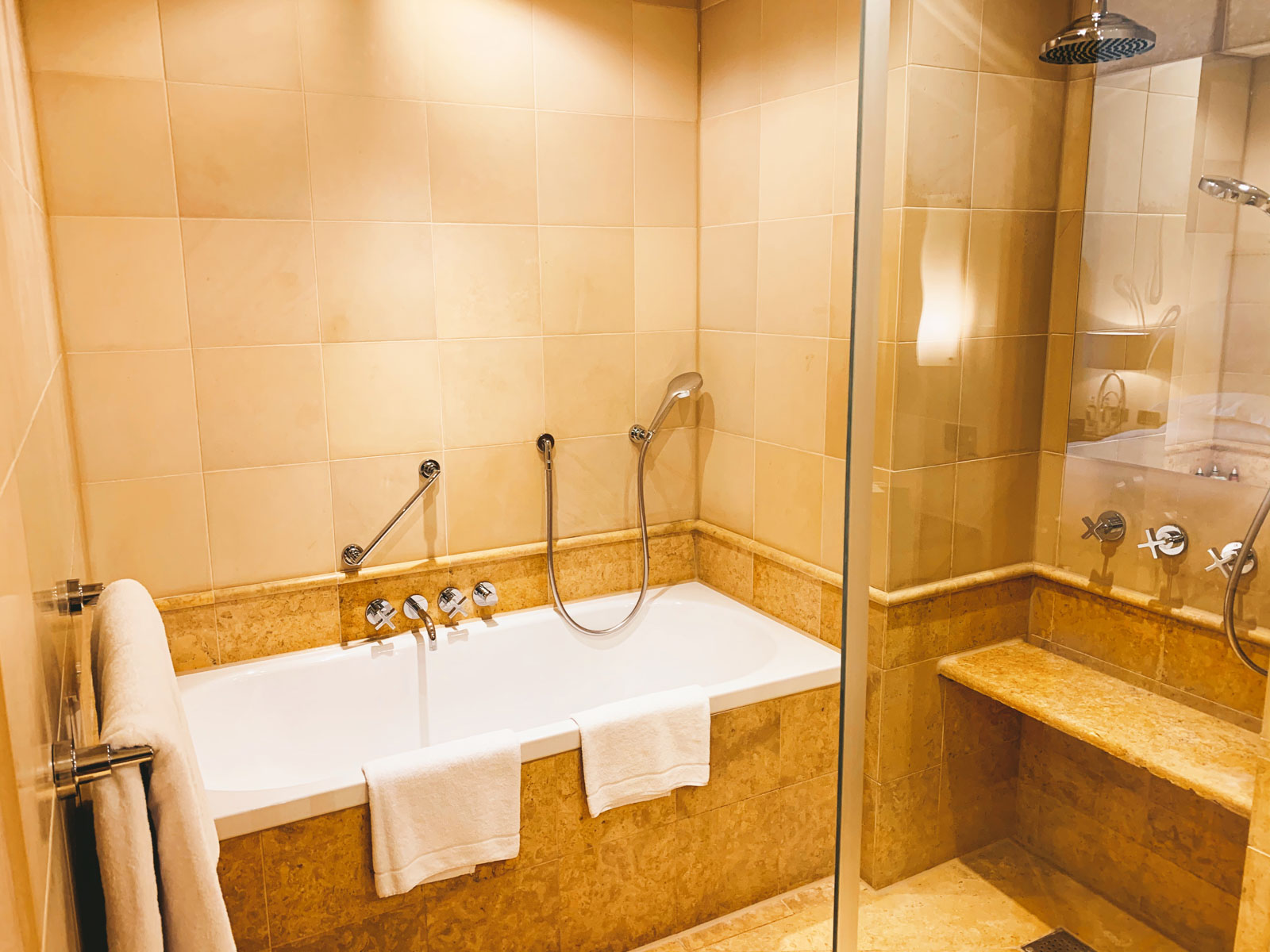 Neben der Tür zum Wohnzimmer gibt es eine weitere Türe in Richtung Bad. Dieses ist ebenfalls nicht gerade klein und bietet genügend Platz für zwei Waschbecken mit jeweils genügend Ablagefläche, einem Amenity-Kit, einem separat abgetrennten WC, sowie einer Duschkabine mit separater Badewanne. Der Duschkopf war etwas komisch positioniert, denn quasi direkt darunter befindet sich eine Ablage/Sitzbank.