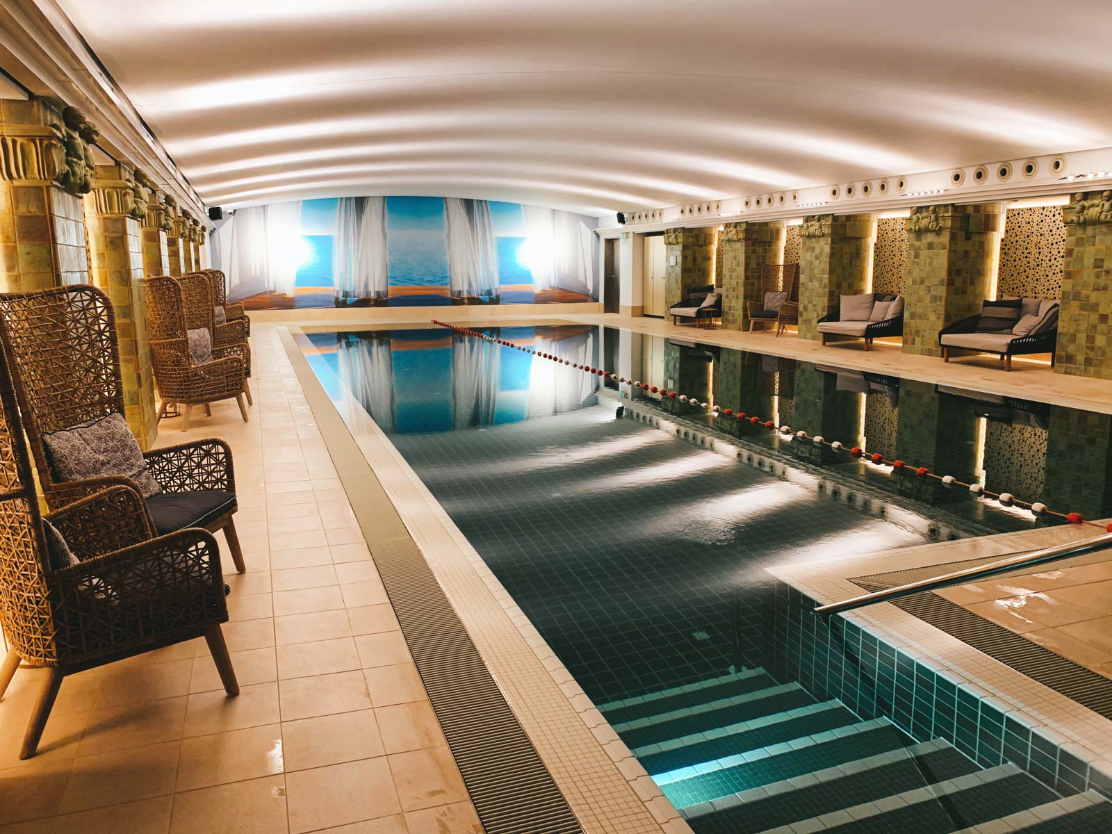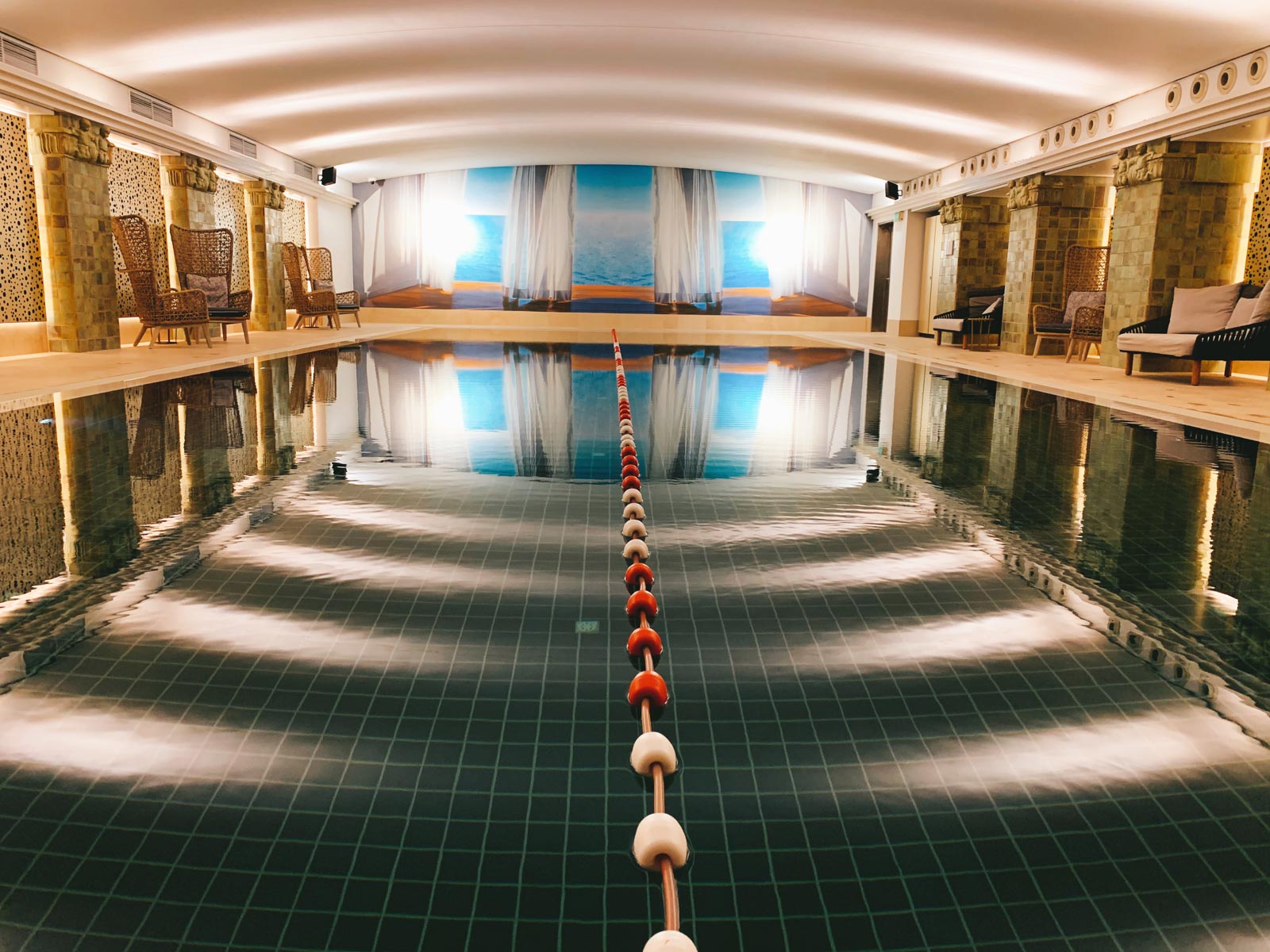 Der Pool und Fitnessbereich im Park Hyatt Hamburg lässt sich derzeit nur mit Terminvereinbarung besuchen, umschauen durften wir uns dennoch in aller Ruhe. Der Whirlpool ist außer Betrieb, Pool, Sauna & Dampfbad dürfen aber benutzt werden. Der Pool hat für ein Hotel im Stadtzentrum eine ordentlich Größe und macht insgesamt einen entspannten Eindruck mit den Stühlen und Liegen links und rechts.