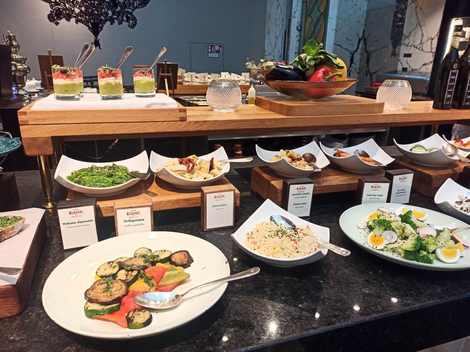 Tatsächlich wussten das Ambiente und das Angebot zu überzeugen. Das Restaurant The Bank Brasserie & Bar ist in der ehemaligen Kassenhalle der einstigen Bank untergebracht und schließt sich direkt an die Lobby an. Es handelt sich um einen lichtdurchfluteten Raum mit sehr hohen Decken und bunt besetzten Fenstern, die fast an eine Kirche erinnern. Rechterhand fand die nicht weniger beeindruckende Bar mit edlen Spirituosen ihren Platz, während auf einer Empore linkerhand das Buffet aufgebaut war. Die verschiedenen Stationen des Buffets verteilten sich rund um die offene Showküche, die den Blick auf das mit Leidenschaft ausgeführte Handwerk des Küchenteams freigab.