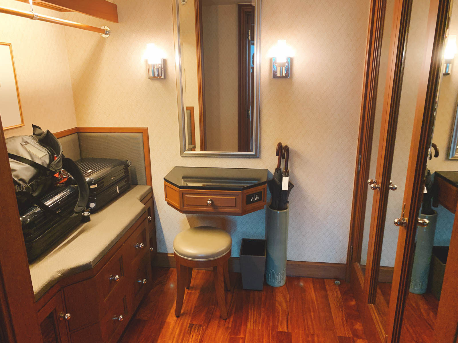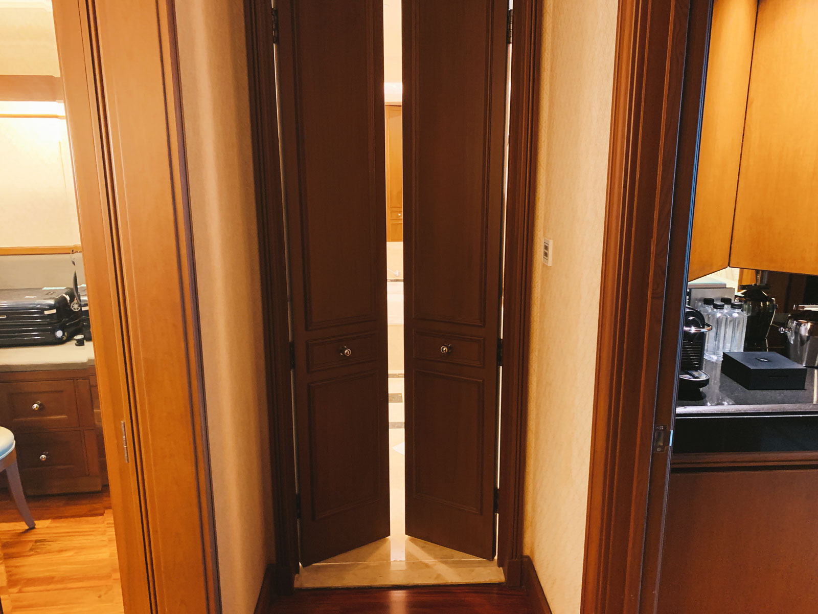 Nach Betreten des Zimmers ist man in einer Art Vorraum; links geht es zum Kleiderschrank und der Kofferablage, geradeaus befindet sich das geräumige Bad und rechts geht es zur Minibar bzw. zum Schlaf- und Wohnzimmer.