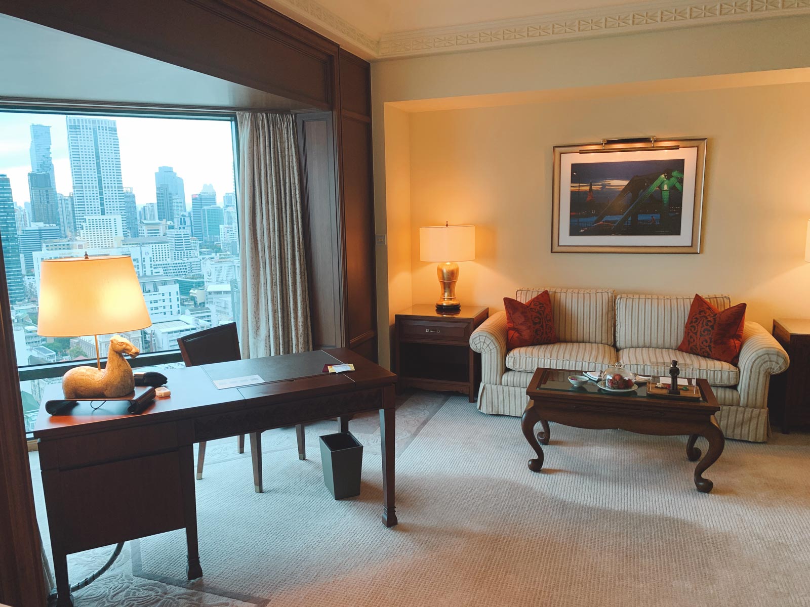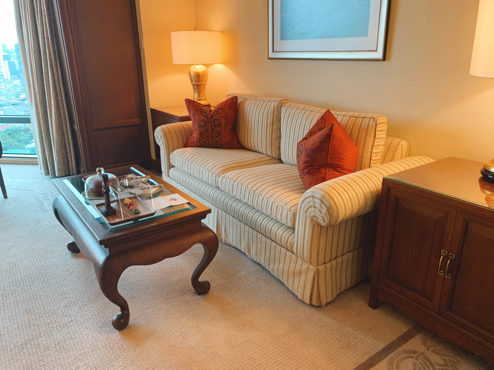 In Richtung Schlafzimmer hat es zunächst die Minibar mit Kaffeemaschine, Wasserflaschen (kostenlos) und oben im Schrank verschiedene Snacks gegen Aufpreis. Anschließend öffnet sich der Raum in ein großes Zimmer, wobei sich die Betten links an der Wand befinden. Geradeaus steht der Schreibtisch, hinter welchem sich eine sensationelle Aussicht über den Chao Phraya und Bangkok erstreckt, an der rechtsseitigen Wand steht das Sofa mit einem Couchtisch davor (auf welchem auch das Willkommensgeschenk wartete).