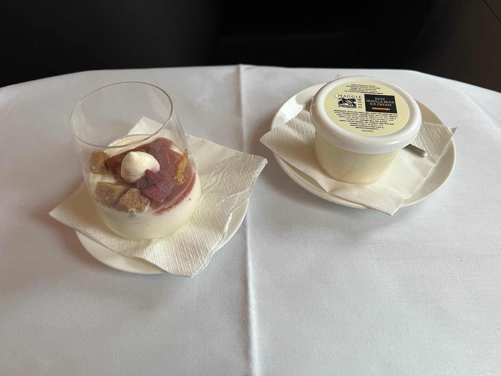 Ich saß ein paar Minuten auf meinem Platz, da kam die Stewardess und bot mir ein Glas Wasser, Brut Champagner oder Saft an. Ich entschied mich für ein Glas Duval-Leroy Brut Champagner. Nachdem das Boarding abgeschlossen war, kam eine Durchsage des Kapitäns, dass wir uns aufgrund von Kühlproblemen in der Galley etwa 20 Minuten verspäten würden. Ein Techniker löste das Problem, aber aufgrund des Wetters verzögerte sich der Start erneut um 30 Minuten, sodass wir letztendlich mit 50 Minuten Verspätung vom Gate gepusht wurden. Leider wurde den Passagieren während der Verzögerung kein weiterer Drink angeboten. Stattdessen kam der Purser einmal vorbei, stellte sich kurz vor und entschuldigte sich wegen der Verspätung. Kurz darauf kam die Stewardess und nahm die Getränke- und Essensbestellung für nach dem Start auf. Anscheinend wurden die falschen Menüs in der Kabine ausgelegt, denn statt Fisch gab es Garnelen mit Gnocchi und anstelle des Sandwiches, welches ich eigentlich nehmen wollte, gab es Pasta mit Rind. Somit entschied ich mich für die Pasta und meine Freundin wählte das Rinderfilet plus die Suppe als Vorspeise. Ich hingegen nahm den Chicken Salat als Starter.