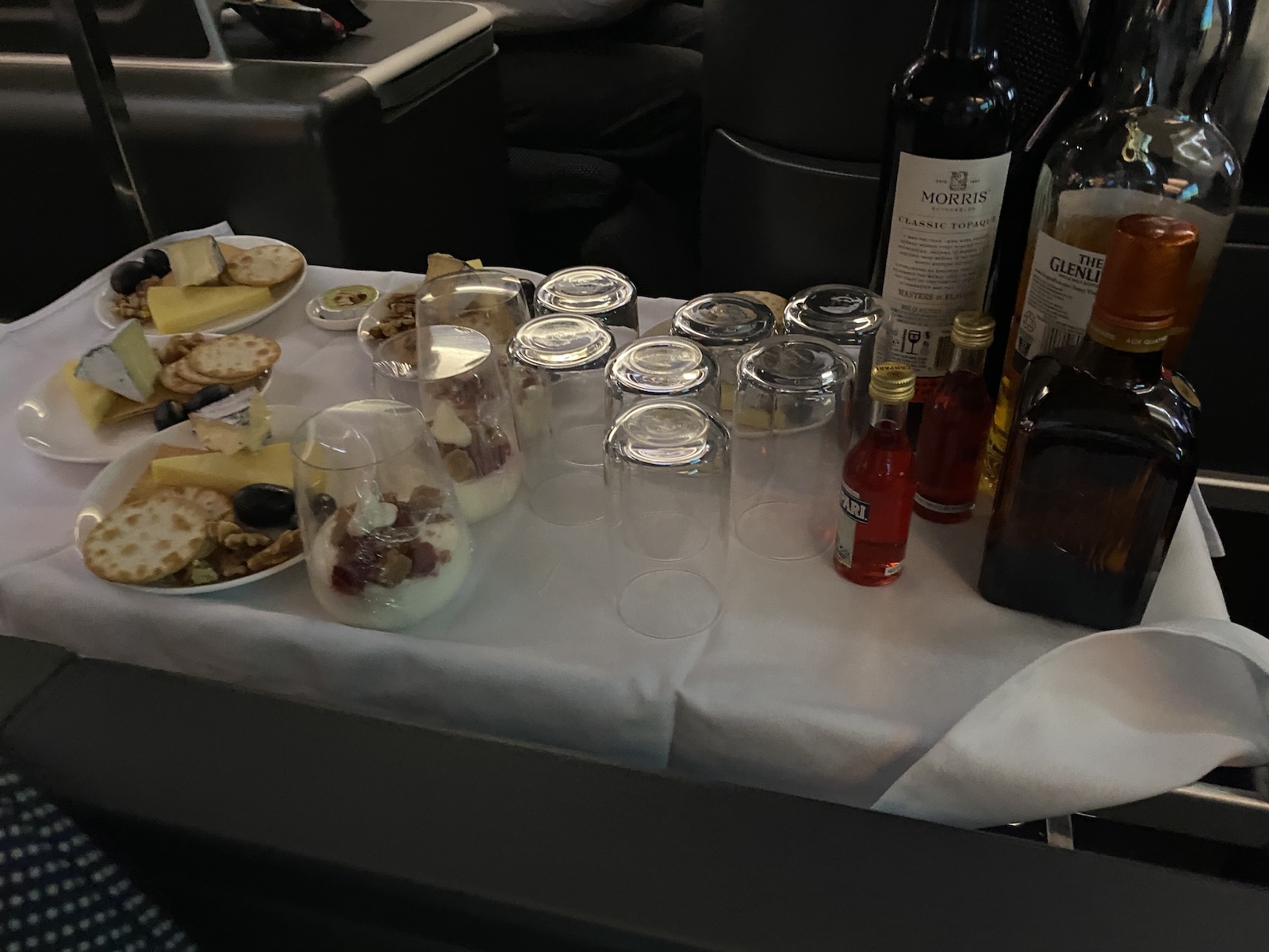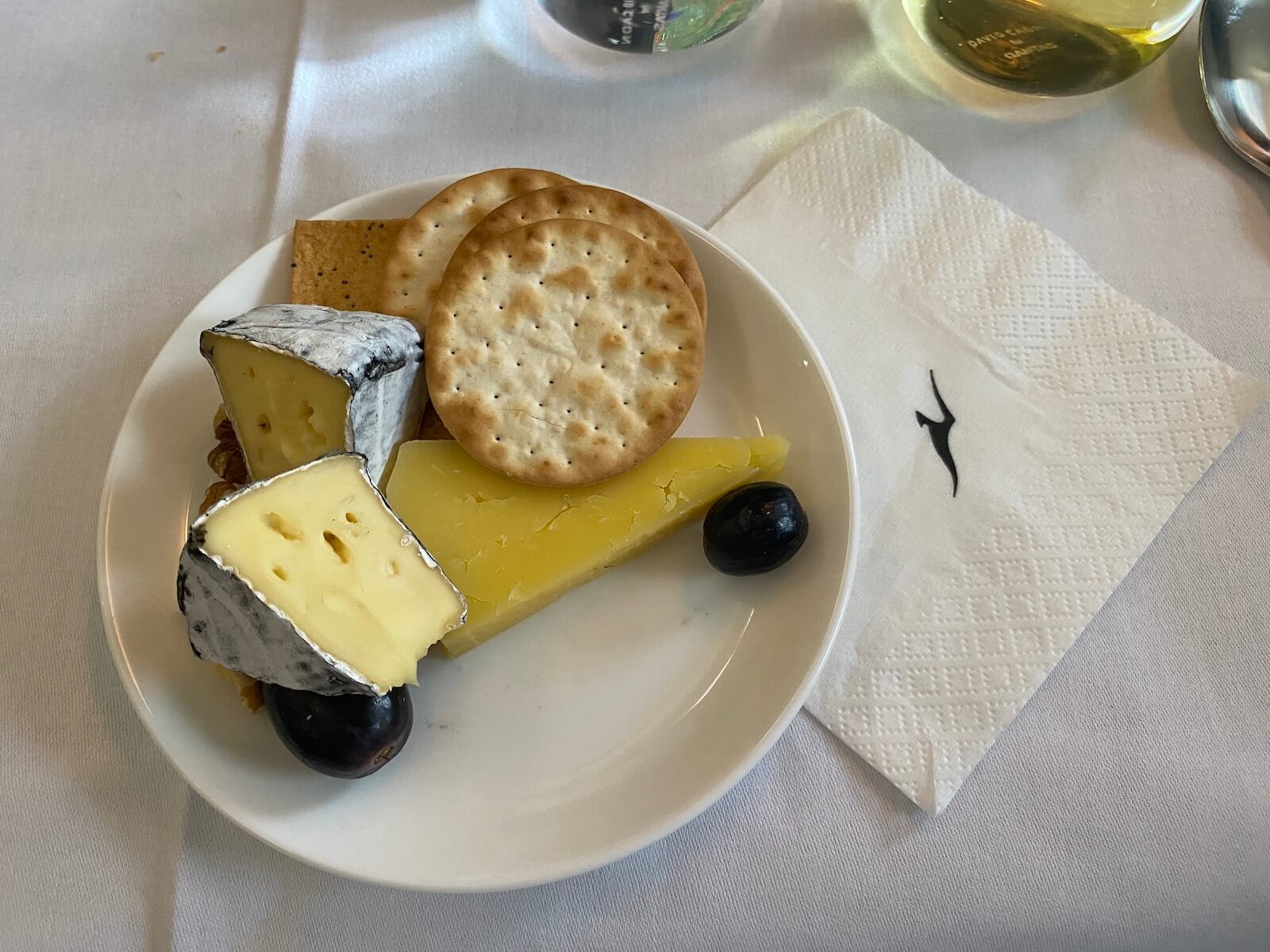 Zum Nachtisch gab es bei mir noch die Käseplatte. Nachdem alle Gäste mit dem Hauptgang fertig waren, ist die Crew noch mit einem Trolley durch die Kabine gelaufen mit den unterschiedlichen Nachtischen und ein Absacker (Baileys, Whisky, etc.). Ich entschied mich spontan noch für das Vanille Creme Caramel und dieses war geschmacklich top.