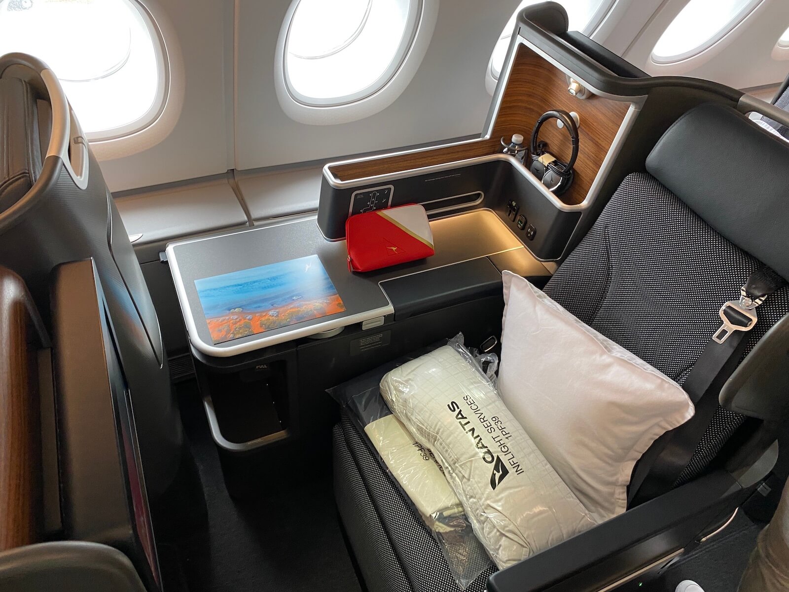 In den letzten Jahren hat Qantas Airways damit begonnen ihre Business Class im Airbus A380 zu erneuern, von der alten 2 – 2 – 2 Konfiguration hin zu einer modernen 1 – 2 – 1 Konfiguration, wie man sie bereits im Airbus A330 und der Boeing 787 vorfindet. Die Umbuchung auf Qantas hatte sich in dem Fall wirklich gelohnt. Wow, was für ein Sitz. Aber dazu mehr im nächsten Abschnitt.