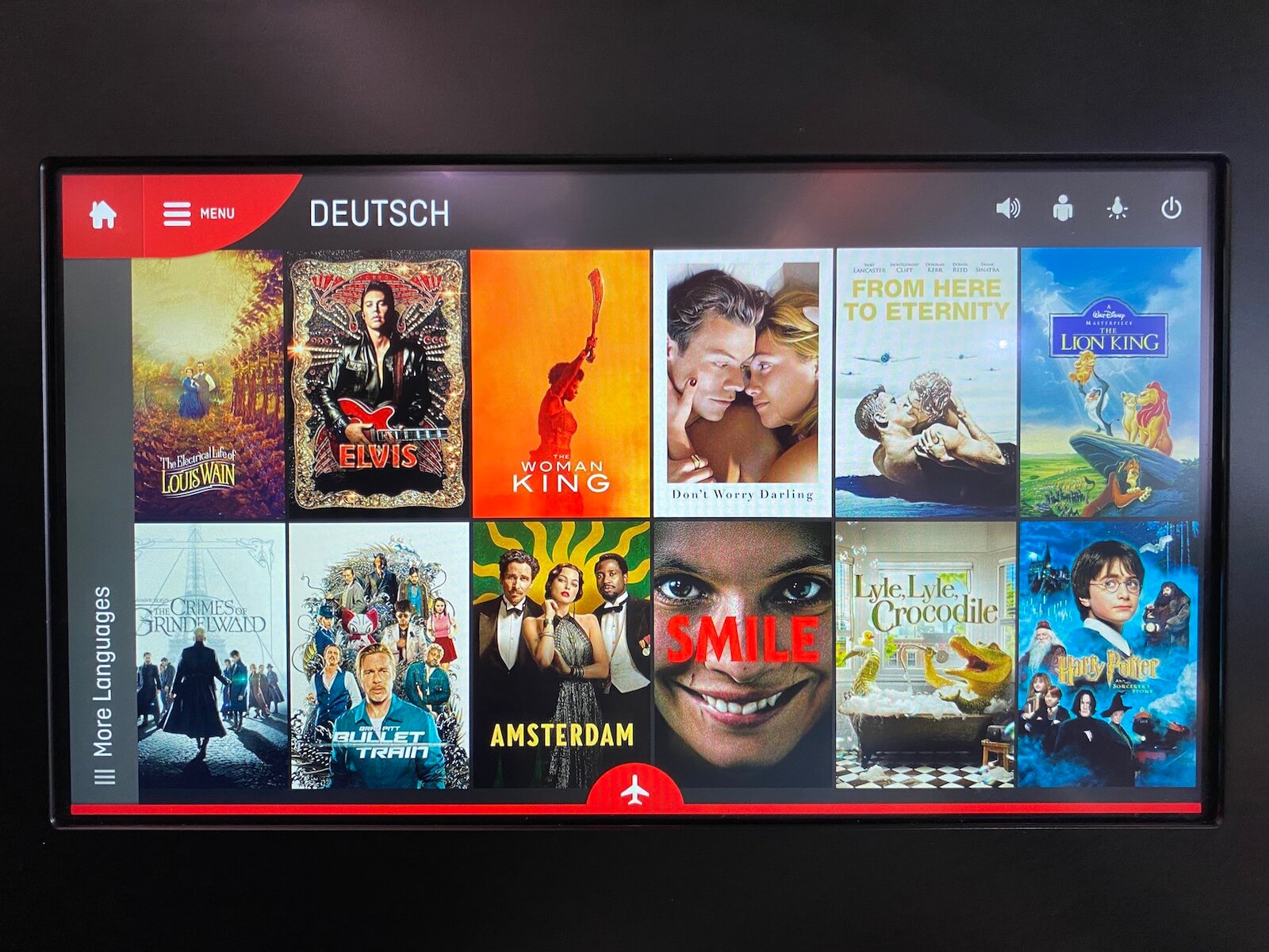Der Monitor war mit 15,5 Zoll etwas kleiner als der Monitor bei EVA Air, wo der gleiche Sitz in einer anderen Ausführung verbaut war. Die Farben auf dem Monitor waren top, kontrastreich und knallig. Die Touch-Funktion funktionierte einwandfrei, sodass ich den Controller gar nicht benötigte. Das Entertainment Programm hatte eine gute Auswahl an Filmen und im Vergleich zu unserem Flug in der Boeing 737, gab es einige der neuen Filme mit deutscher Tonspur.