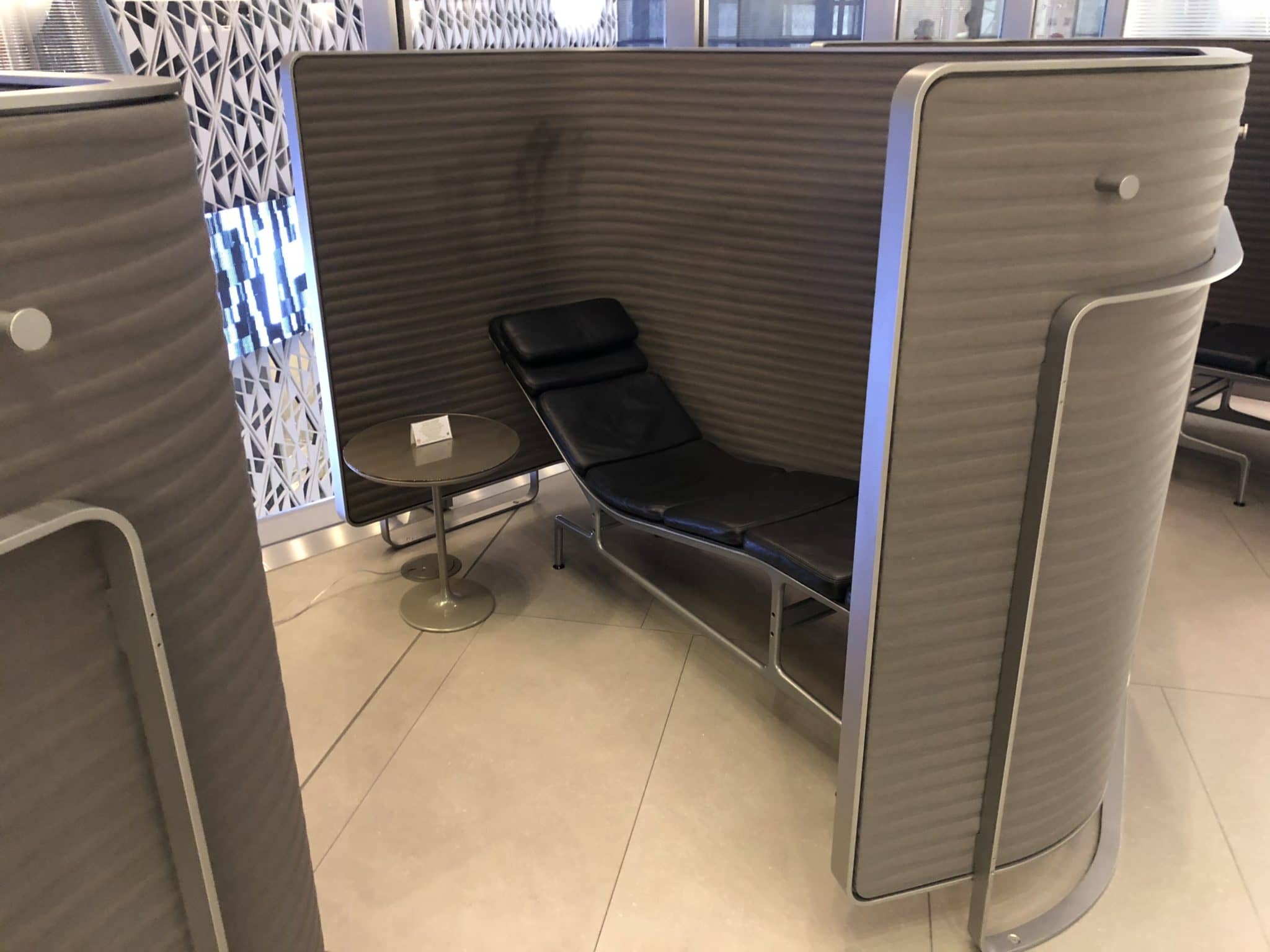 Nachdem man die Lounge betreten hat, bieten sich einem zahlreiche Optionen, um die Wartezeit bis zum nächsten Flug zu überbrücken. Die einzelnen Bereiche der Lounge sind immer mit einem Wegweiser, bzw. Beschriftung des Bereiches versehen. Rechts, hinter der Trennwand, befinden sich Schließfächer, wo man Tasche oder Rucksack verstauen kann. Eine gute Gelegenheit, falls man die Lounge verlassen und sich in den zahlreichen Duty Free Läden umschauen möchte. Ebenfalls in diesem Bereich befinden sich kleine Ruhekabinen mit Liegen, sie man zum Ausruhen nutzen kann. Für die Ruhekabinen und die Duschen gilt das Prinzip „first come, first serve“.