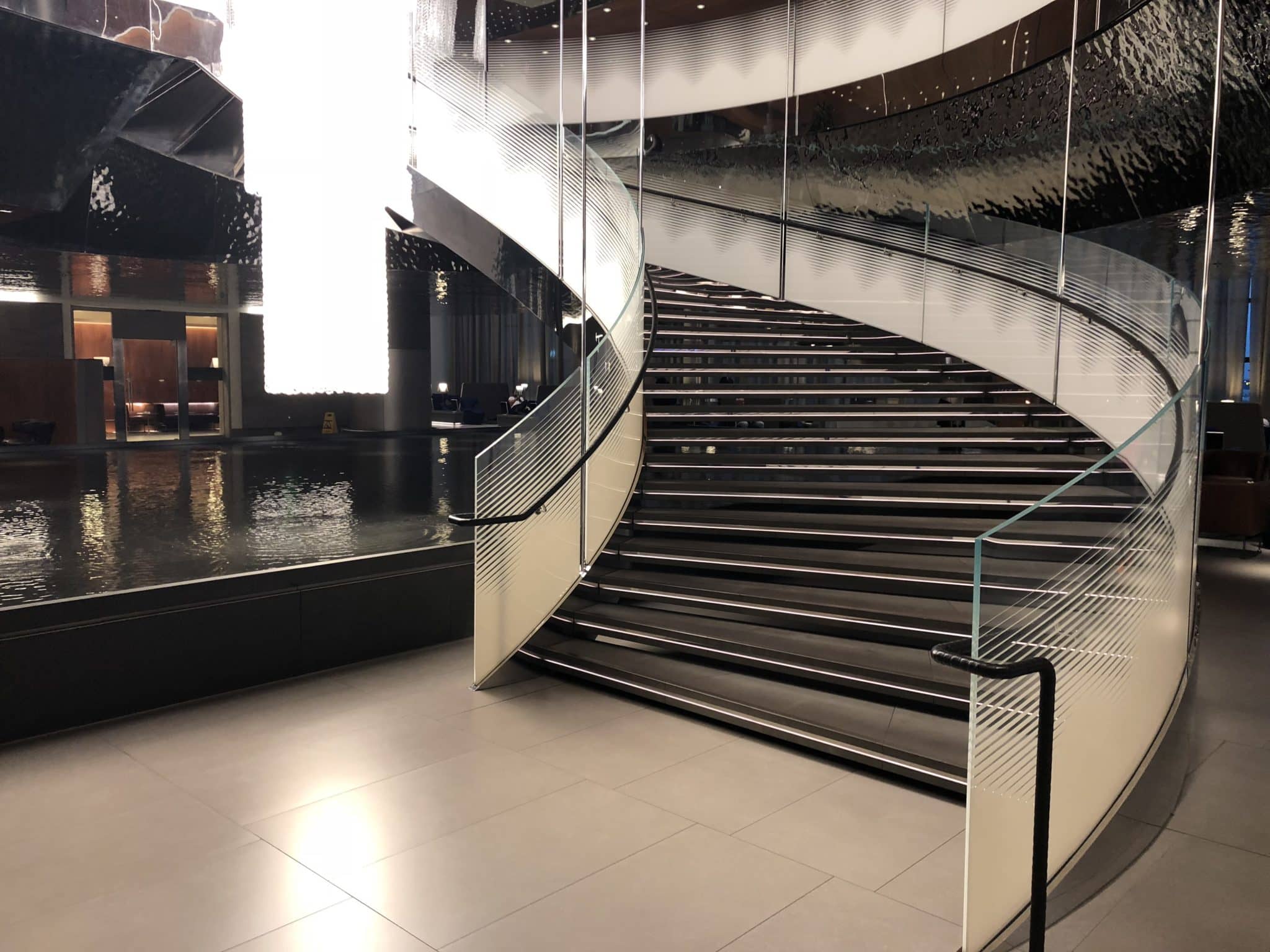 Auf der rechten Seite hinter dem Eingang ist die große Treppe, die einen zum Restaurant führt. Jeweils am Fuß und am Kopf der Treppe wird man erneut von Mitarbeitern erwartet, begrüßt und eingewiesen. Verloren wird man in der Lounge trotz der Größe sicher nicht gehen.