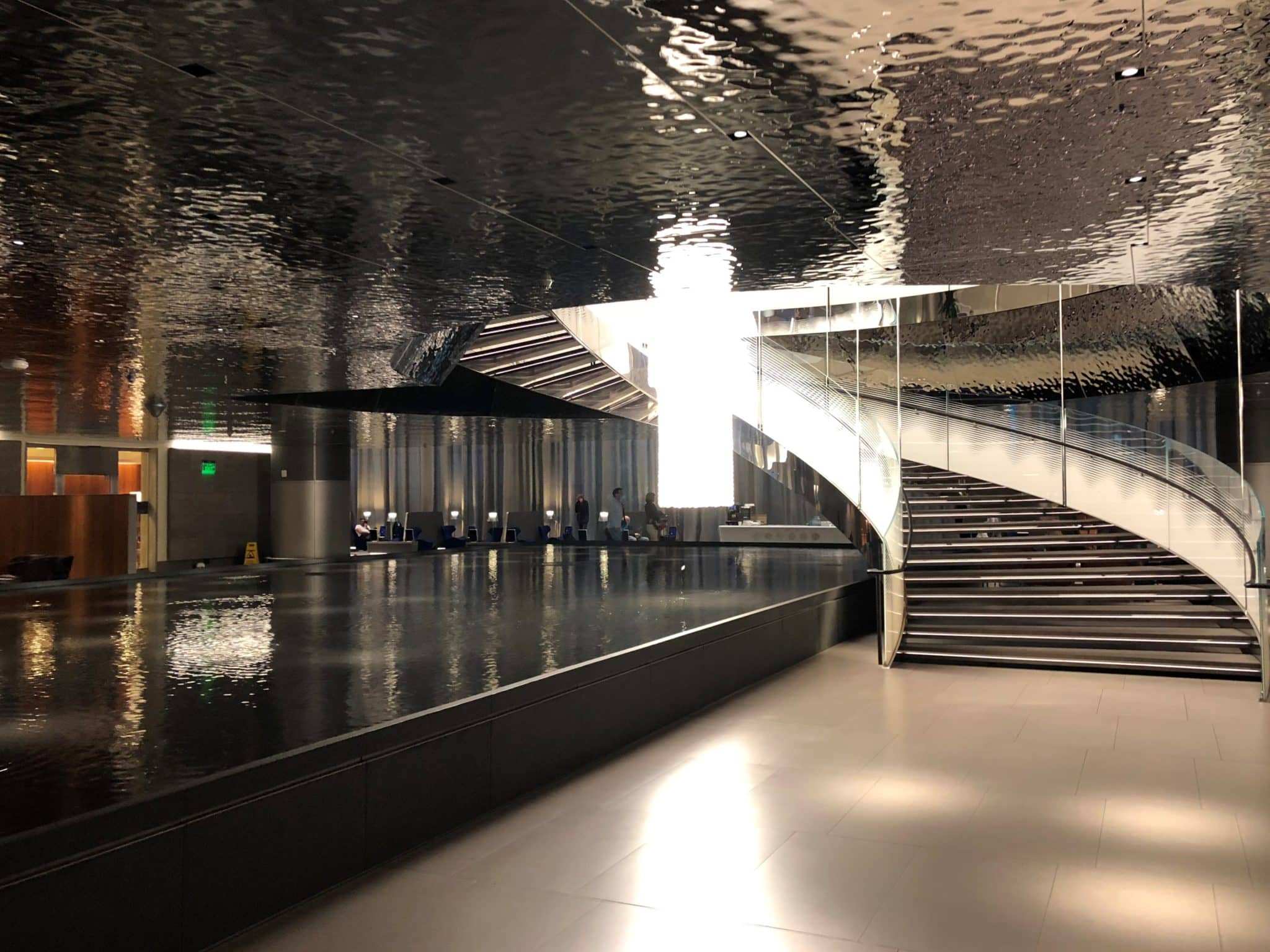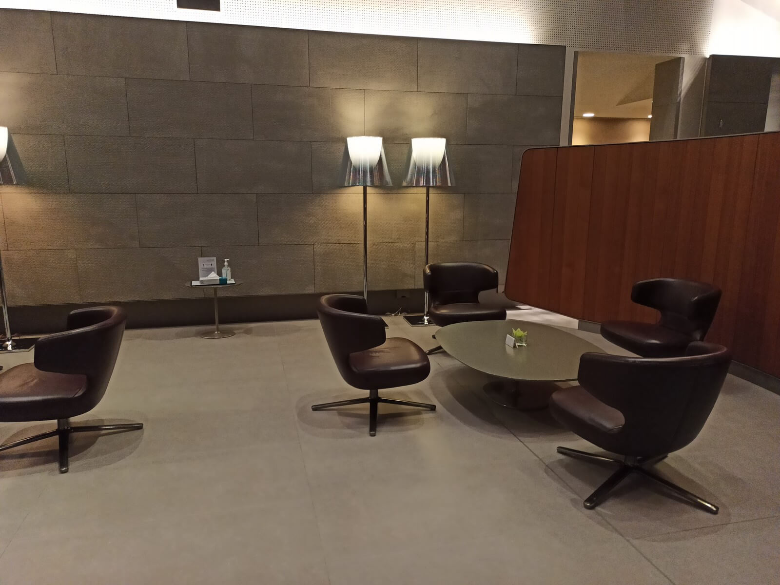 Wir folgten den Hinweisschildern zur Lounge und gelangten über die lange Rolltreppe direkt zum Anmeldeschalter. Dort erwartete uns ein Servicemitarbeiter und wies uns den Weg. Denn hier gibt es eine Trennwand, um die man herumgehen muss, bevor man das erste Mal das Innere der Lounge sehen kann. Gleich hinter der Trennwand erwartete uns erneut ein Mitarbeiter, der unsere staunenden sowie fragenden Blicke richtig deutete und uns den Aufbau der Lounge erklärte. Sehr hohe Decken und breite Gänge gehören in dieser Lounge zum Standard, somit lässt sich sehr gut Abstand zu den Mitreisenden halten.
