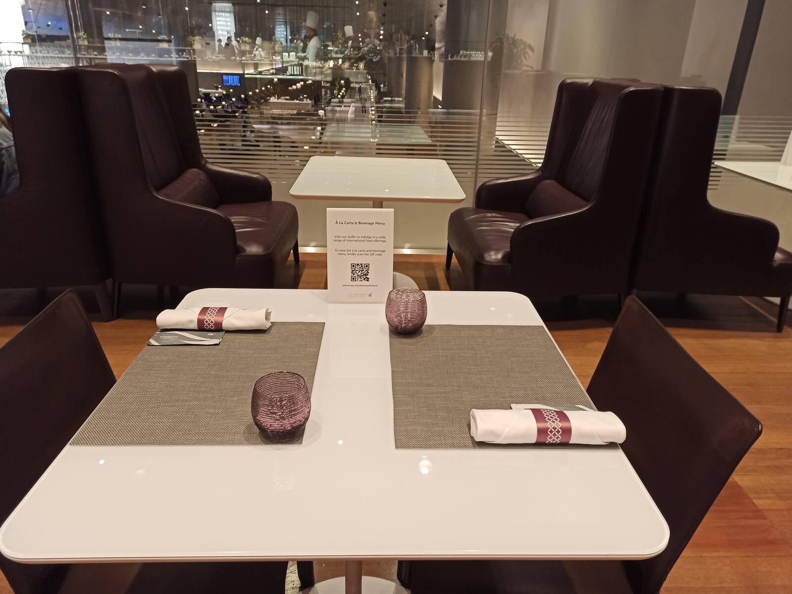 Im oberen Bereich der Lounge befindet sich ein Restaurant mit Buffet, à la carte-Angebot und einer größeren Bar. Sitzt man am Fenster, hat man einen guten Überblick über die Lounge. Aufgrund von Corona weicht das kulinarische Angebot der Qatar Airways Al Mourjan Business Class Lounge etwas ab. Immerhin ist es der Lounge in Doha gestattet – im Gegensatz zu den Lounges in Frankfurt –Essen und Getränke zu servieren. Hat man Platz genommen, darf man die Maske abnehmen. Auf den Tischen befinden sich QR-Codes, die einen zur digitalen Speise- und Getränkekarte führen.