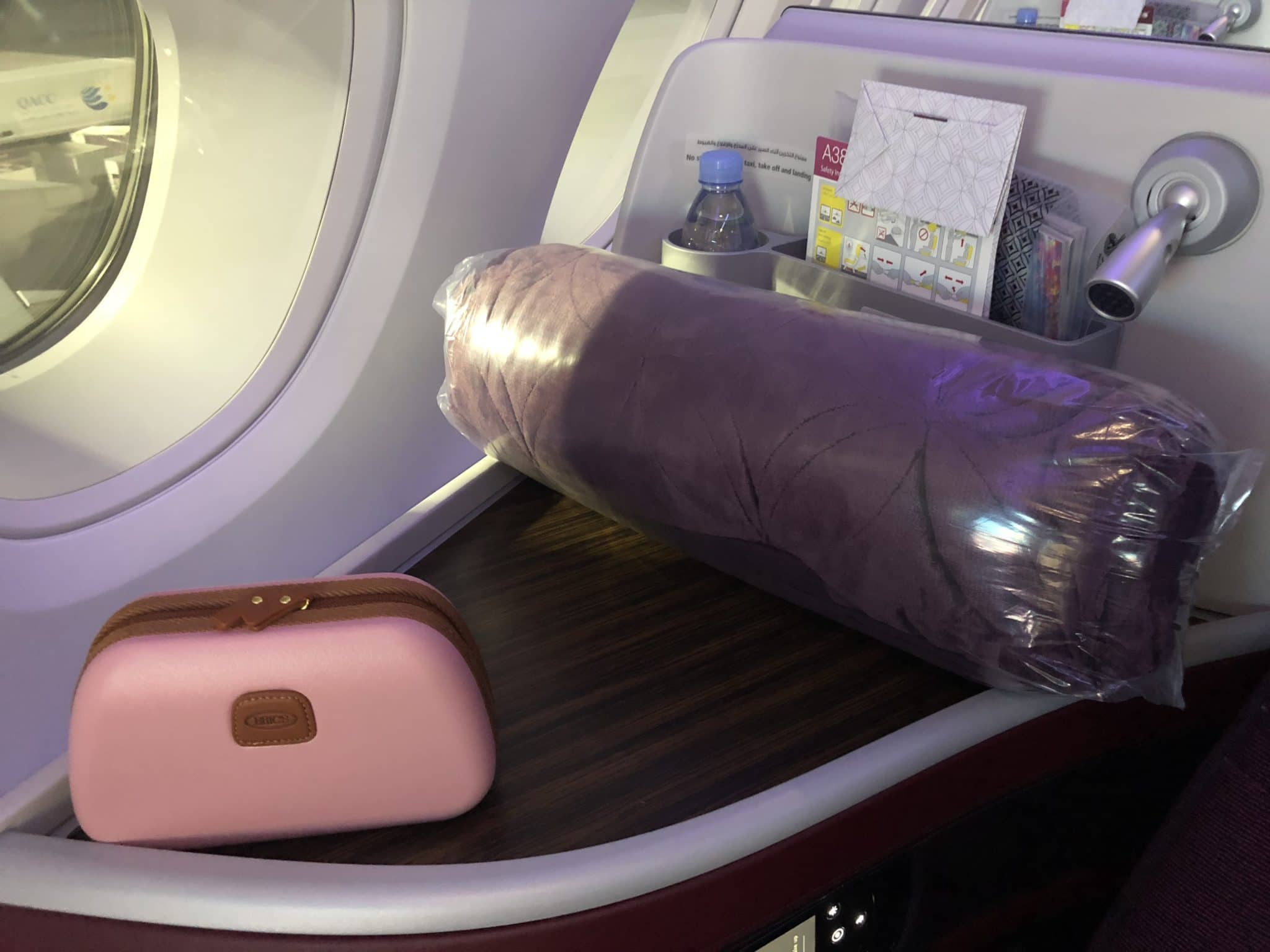 Das Service-Erlebnis auf diesem Flug war sehr gut – vermutlich das beste bisher. Beim Einsteigen begrüßte mich einer der Stewards und wies mich in den richtigen Gang. An meinem Platz angekommen, begrüßte mich eine der zuständigen Stewardessen, Anna. Sie stellte sich kurz vor und erklärte mir alles an meinem Sitz. Sie sagte, dass sie später in der Lounge/Bar arbeiten würde und ihre Kollegin, sowie Alex, der Flight Manager dann für uns zuständig seien. Sie erklärte ebenfalls, dass die Amenities die Farbe Pink hätten, da Qatar Airways damit die Bekämpfung von Brustkrebs unterstützen würde. Der Inhalt des Amenity Kit bestand aus Ohrstöpseln, Schlafmaske, Socken, Gesichtscreme und ein Feuchtigkeitsspray.