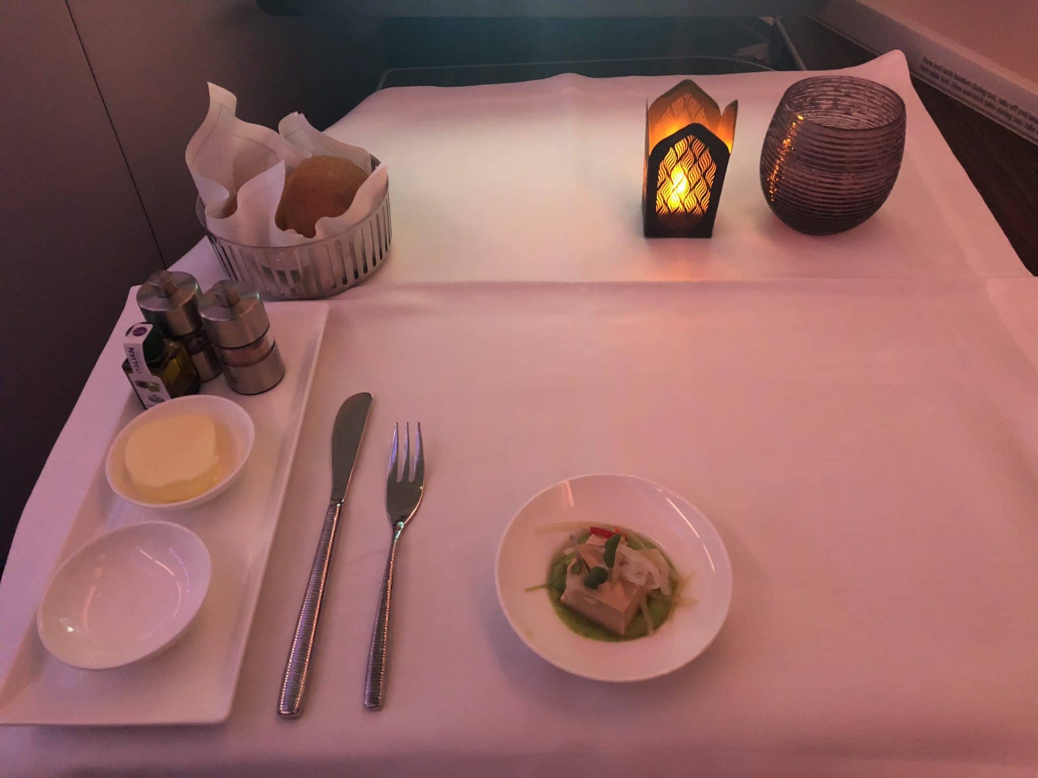 So ging es rasch zurück zum Platz, der schnell gedeckt wurde. Los ging es mit dem Gruß aus der Küche, es gab Tofu, das einem Erbsenpüree ähnelte. Genaueres kann ich dazu nicht sagen, da mir der Name für das Gericht und Google ebenfalls nicht bekannt war. Schön fand ich übrigens die Salz- und Pfefferstreuer, die von WMF hätten sein können. Dressing und Olivenöl sind von Monte Vibiano. Auf die Suppe habe ich verzichtet und startete gleich mit dem Chicken Salat als Vorspeise. Bei der Hauptspeise entschied ich mich für das Grilled Beef Steak. Bei Qatar Airways habt ihr nicht, wie zum Beispiel bei Singapore Airlines oder EVA Air die Möglichkeit euer Hauptgericht vor dem Flug online zu bestellen. Dafür könnt ihr aber wann immer ihr wollt essen und nicht nur zu vorgegebenen Zeiten. Zum Essen wurden unterschiedliche Brote serviert, aber leider kein Garlic Bread. Bei der Nachspeise entschied ich mich für die Eiscreme. Ich kann mich bei keinen der Speisen beschweren, alles schmeckte, wie immer, sehr gut.