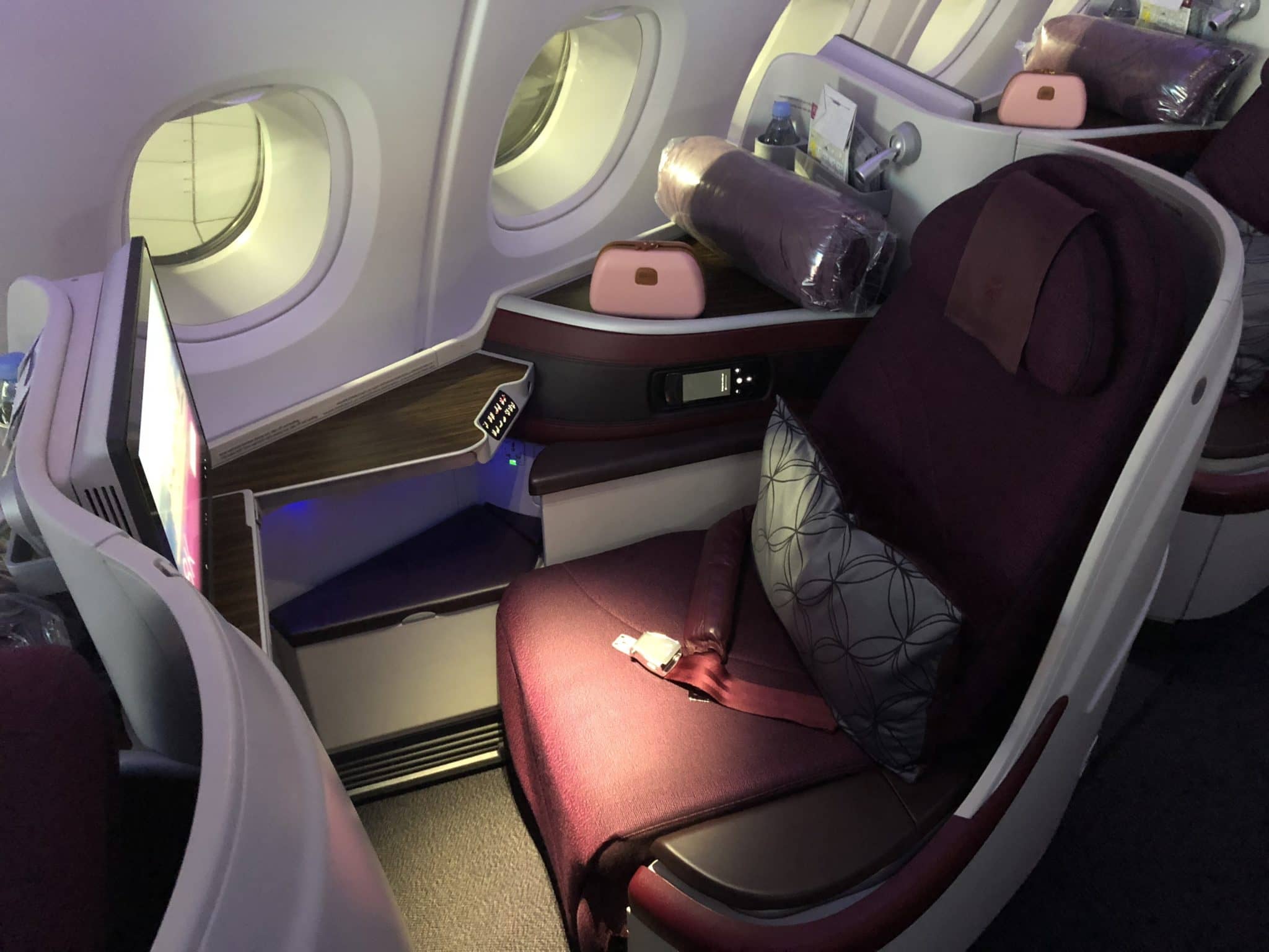 Wie in den meisten Flugzeugen von Qatar Airways ist in der Business Class ein Herringbone Seat verbaut. Die neuen Qsuites werden erst Schritt für Schritt in den alten Flugzeugen verbaut. Im Vergleich zum vorherigen Flug, dem Dreamliner 787-800, war hier allerdings eine neuere Variante des Herringbone Sitzes verbaut. Die Veränderungen hatten aber keine Auswirkung auf den Sitz oder den Komfort beim Schlafen.