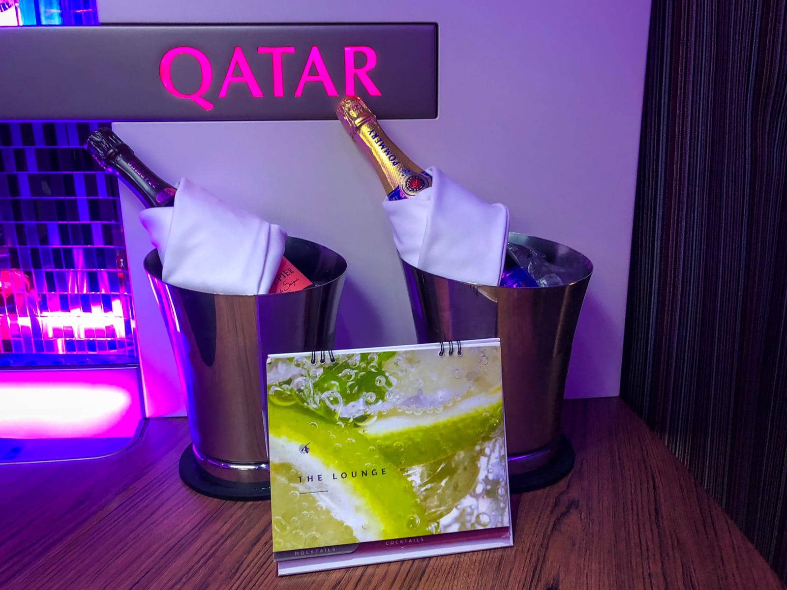Direkt nach dem Start ging es für mich in die Lounge. Ich war noch nie in einem Flugzeug, das eine Bar an Bord hatte. Ich hätte auch nicht gedacht, dass eine Bar an Bord so cool sein kann. Als ich die Bar betrat wurden gerade Getränke, Snacks und kleine Häppchen aufgebaut. Witzig ist, dass die Flaschen dekorativ hinter der Bar aufgebaut werden, die Getränke aber mit den kleinen hochprozentigen Fläschchen vom Rollwagen gemixt werden.