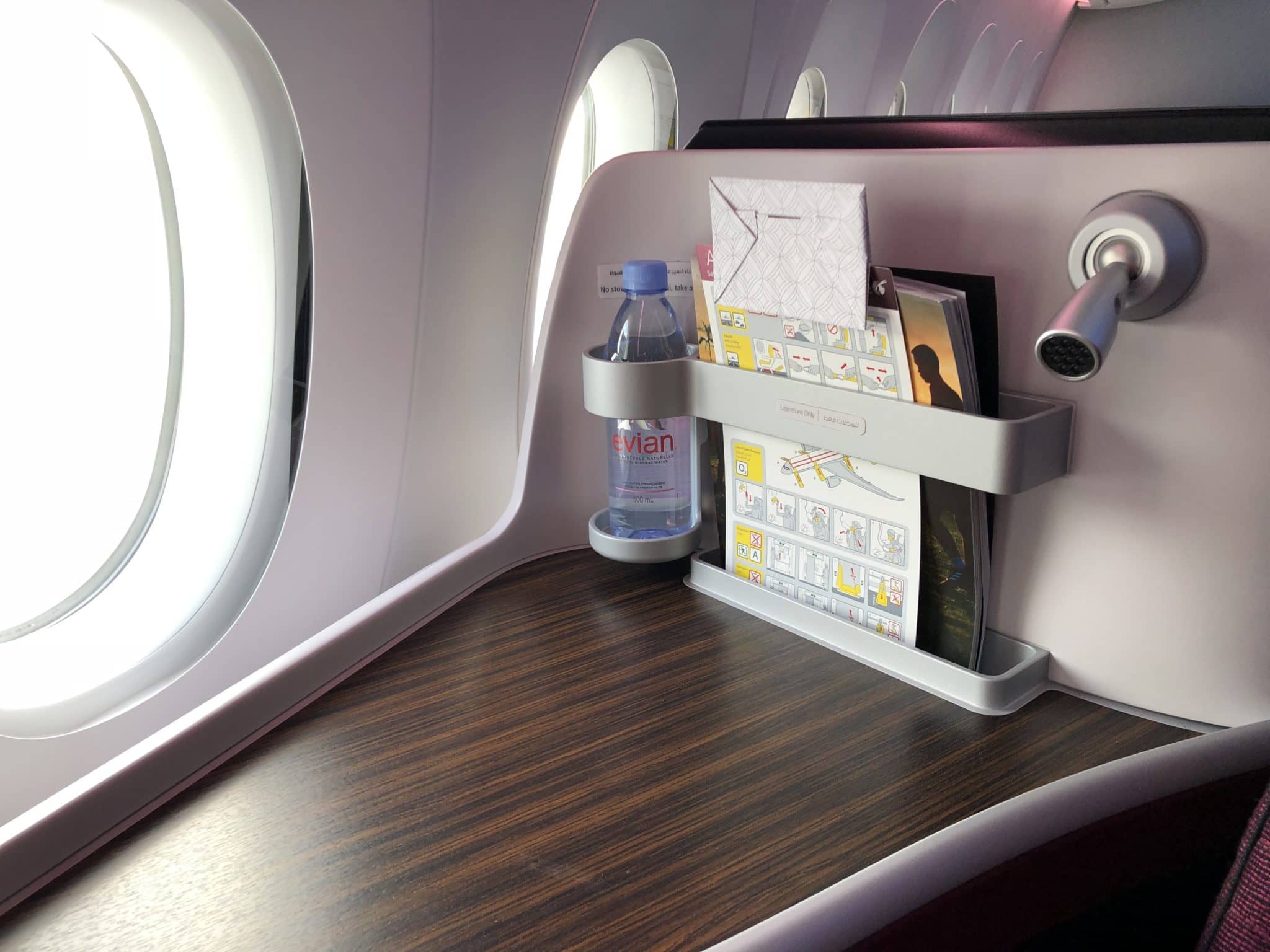 Auf der Fensterseite des Sitzes gibt es eine größere Ablagefläche. Dort waren beim Betreten des Flugzeugs bereits das Amenity Kit und die Decke abgelegt. Optimal eignete sich die Ablagefläche auch zum Ablegen eines Notebooks. Allerdings ist die Ablagefläche auch sehr rutschig und zum Start oder Landung sollte man dort wohl möglichst nichts Wertvolles ablegen.