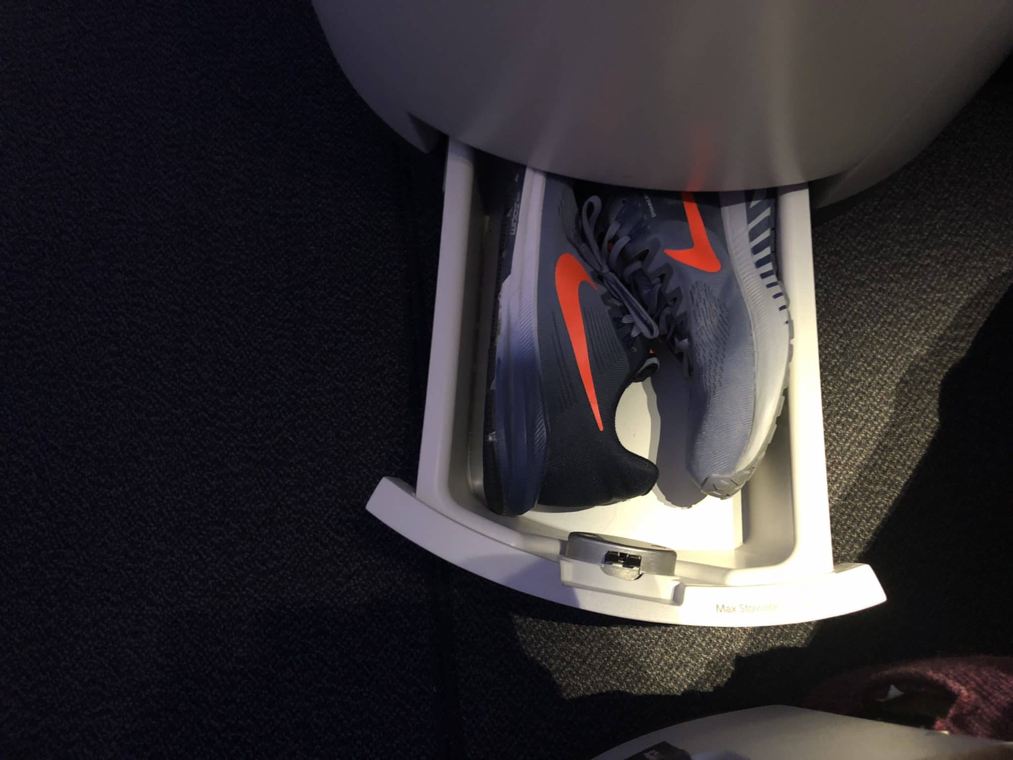 Der Monitor ist fest verankert und lässt sich nicht verstellen. In der Liegeposition lässt es sich daher nicht mehr ganz so entspannt einen Film schauen. Der Tisch befindet sich direkt unter dem Monitor und wird zum Essen durch einen kleinen Hebel an den Fluggast herangezogen. Dieser hätte meiner Meinung nach noch ein paar Zentimeter weiter ausfahren können. Einen Ottomanen, um die Füße abzulegen, gab es. Jedoch war keine Möglichkeit gegeben unter diesem Schuhe oder Ähnliches zu verstauen. Hierfür gibt es stattdessen eine Schublade, die in den nächsten Sitz eingebaut ist. Bei Schuhgröße 46/47 haben meine Schuhe allerdings schon nicht mehr in die Schublade gepasst. Somit musste ich diese im Fußraum abstellen, was aber auch beim Umrüsten zum Bett nicht weiter gestört hat.
