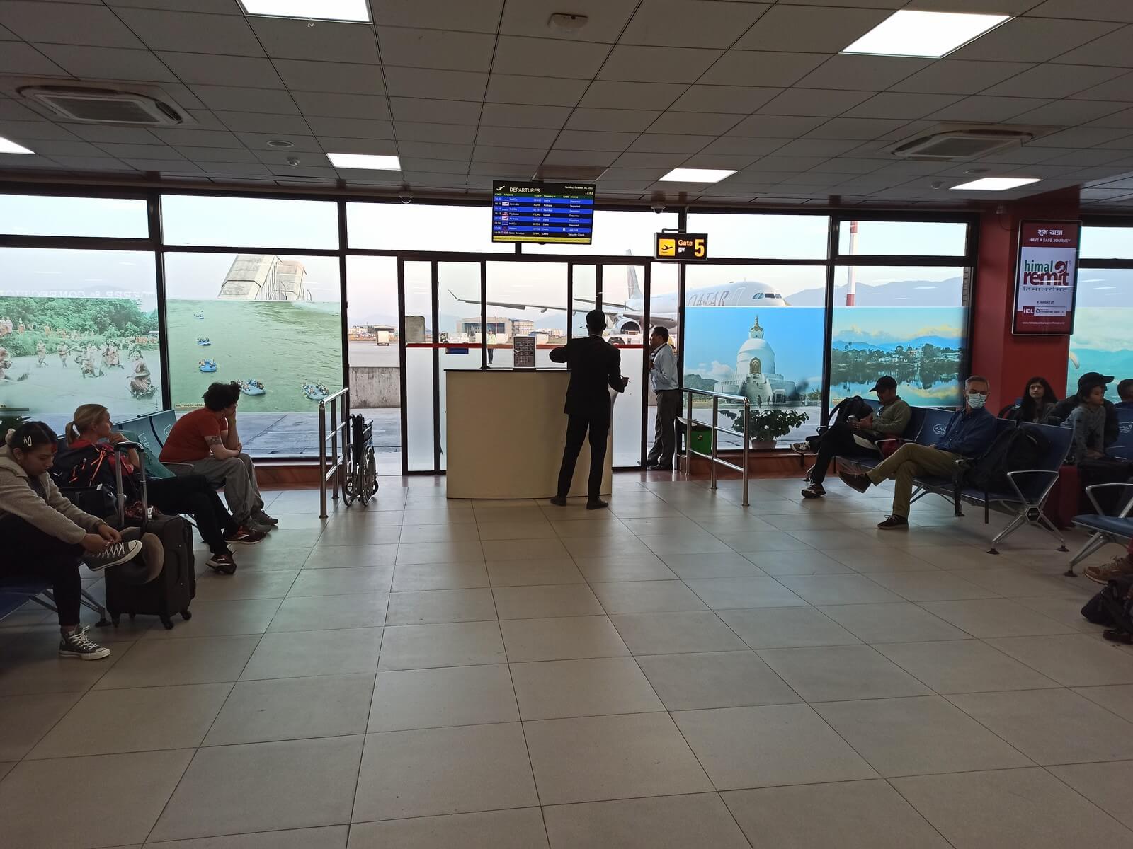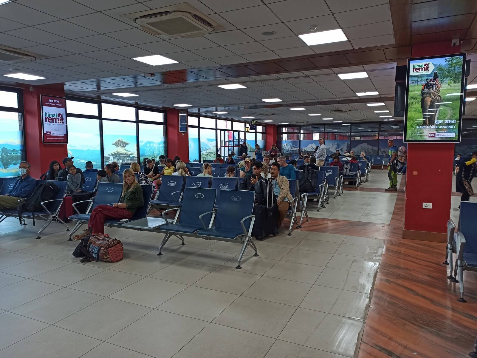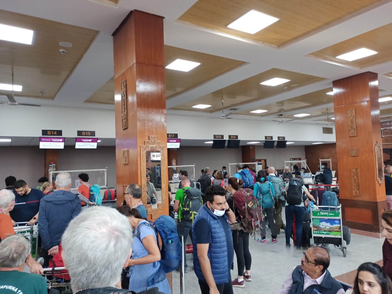 Im internationalen Terminal des Tribhuvan International Airport in Kathmandu gibt es Check-In-Schalter, die in Bereich A und Bereich B aufgeteilt sind. Als wir im Terminal ankamen, war der Qatar Airways Flug auf den Informationsbildschirmen noch keinem der beiden Bereiche zugeteilt. Die Schalter in Bereich A waren komplett leer und schienen hauptsächlich der staatlichen Nepal Airlines vorbehalten zu sein, weshalb wir auf gut Glück Bereich B aufsuchten. Und tatsächlich waren hier die Check-In-Schalter von Qatar Airways untergebracht und bereits für den Check-In geöffnet. Es bildeten sich schon lange Schlangen, denn das kleine Gepäckband hinter den Countern stieß durch die vielen Gepäckstücke der Nepalurlauber und der Einheimischen an seine Grenzen. Man sollte also Zeit für den Check-In bzw. die Gepäckaufgabe mitbringen. Auch Reisende ohne Aufgabegepäck müssen in Kathmandu an den Schalter, da man zwar online einchecken jedoch nicht die Bordkarte erstellen kann.