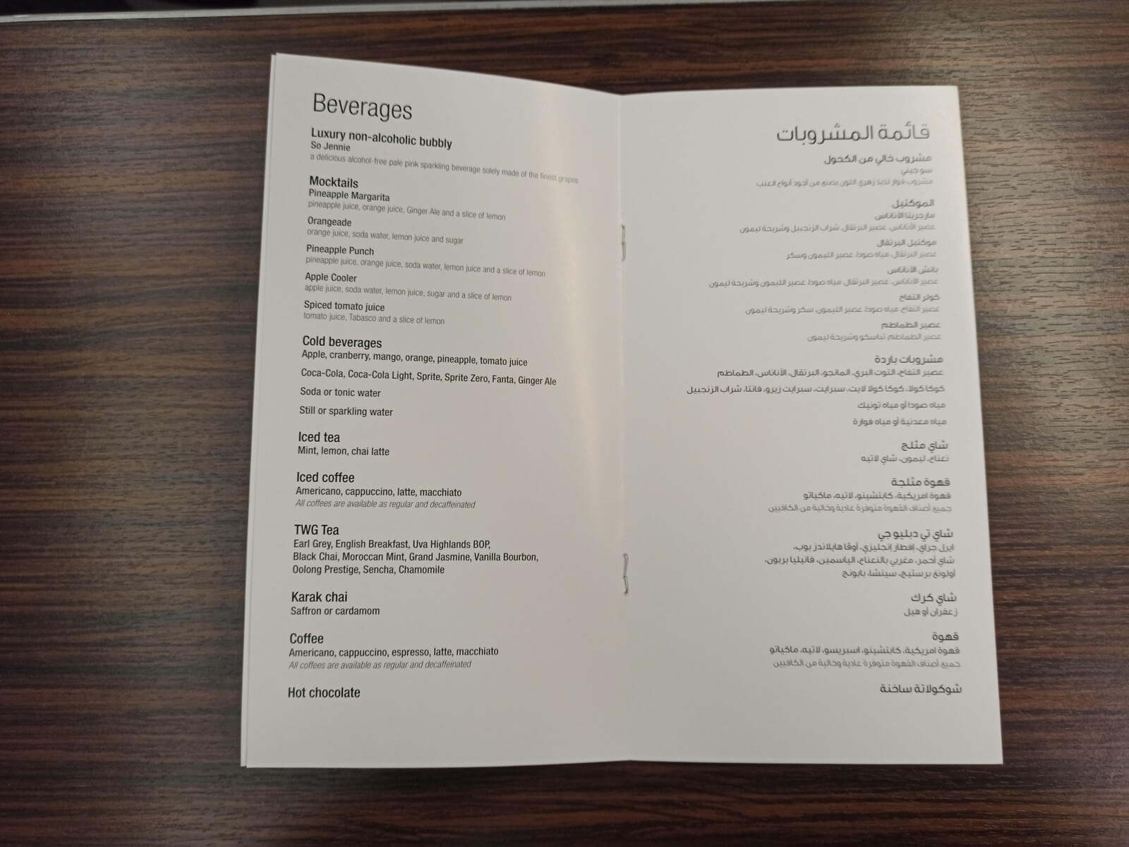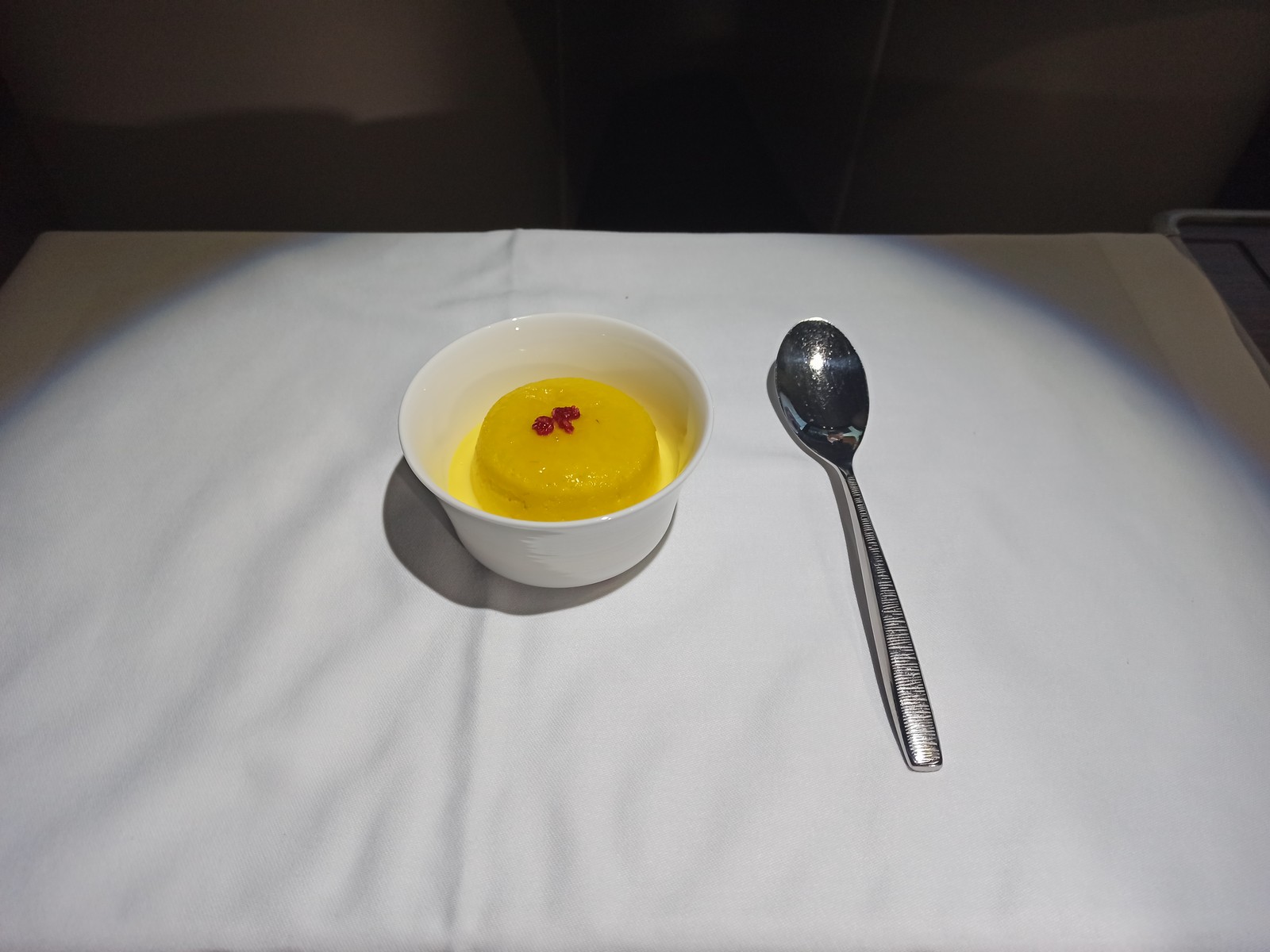 Etwa eine halbe Stunde nach dem Start wurden uns die beiden Mocktails, die wir bestellt hatten (Pineapple Punch und Apple Cooler – beide sehr lecker), mit Nüssen serviert und kurz darauf folgte schon das eigentliche Essen. Der Plan, uns zunächst die Vorspeise zu teilen, ging nur bedingt auf. Denn während Lisa die Mezze gereicht wurden, wurde mir zeitgleich schon das Hauptgericht serviert. Die Mezze, bestehend aus Hummus, Muhammara und Taboulé, dazu kleine Fladenbrote, waren geschmacklich gut. Einziges Manko: die beiden Dipps bzw. der Salat waren wirklich sehr kalt und hätten etwas früher aus der Kühlung gekonnt. Anschließend servierte mir die Flugbegleiterin wie vereinbart eins der beiden Desserts nach ihrer Empfehlung: Malai, ein pudding-ähnlicher Nachtisch auf Basis von gesüßter Würzmilch aus der indischen Küche. Geschmacklich erinnerte die Creme etwas an Marzipan. Nach dem Essen wurden ein weiteres Erfrischungstuch und Pralinen gereicht.