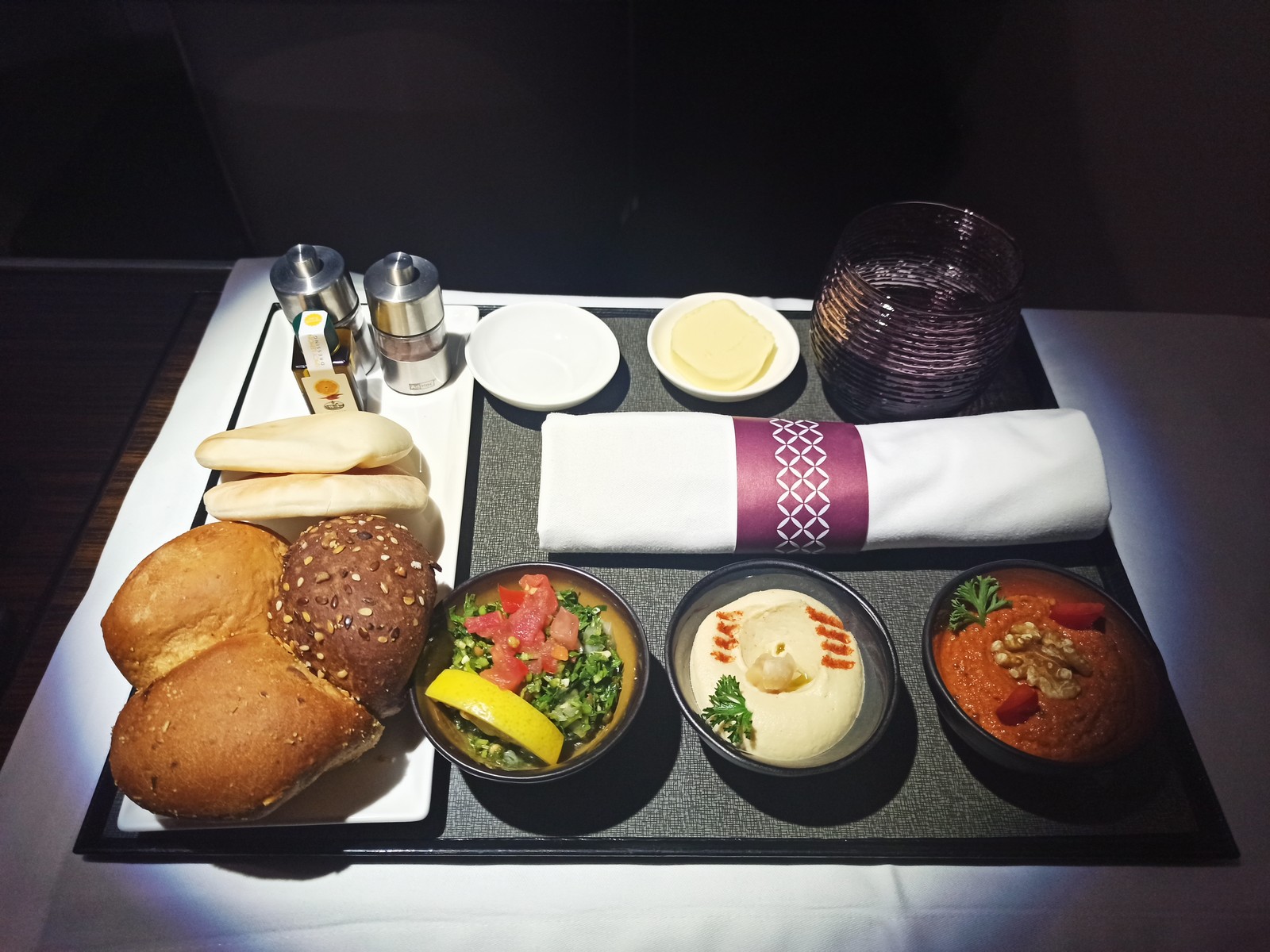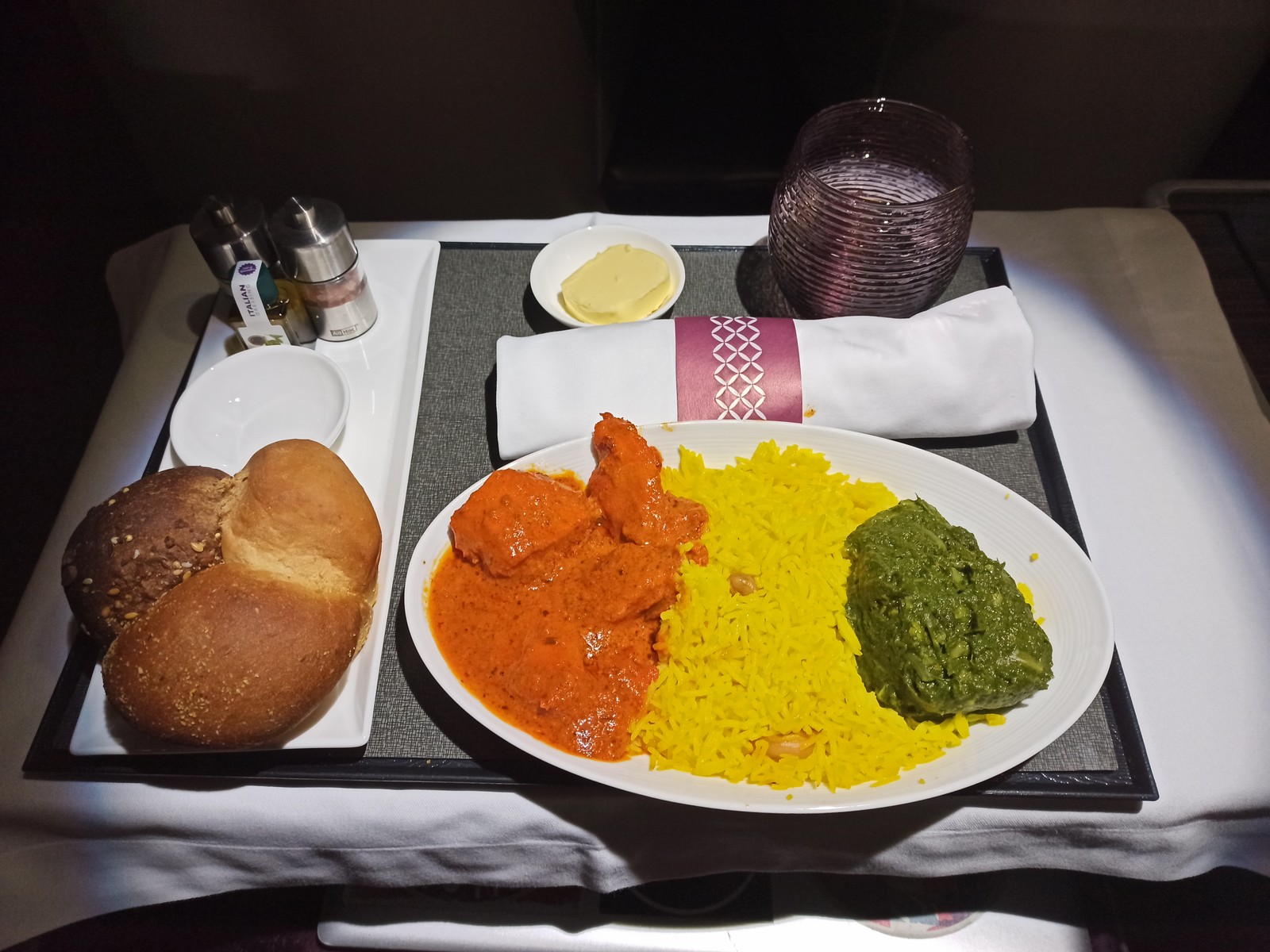 Bei uns in der vorletzten Reihe angekommen, war zunächst unklar, ob die Vorspeise Arabic Mezze noch vorhanden war und wir wurden um etwas Geduld gebeten. Diese Vorspeise kennen wir schon von vorherigen Qatar Flügen und ist der Signature Starter der Airline. In der Zwischenzeit wählten wir die Hauptgerichte: Ich entschied mich für das Chicken Tikka Masala mit Safranreis, meine Frau für das fleischlose Gericht bestehend aus Paneer (Hirtenkäse), verschiedenem Gemüse und Reis. Auf die Suppe verzichteten wir beide. Als ich das Dessert bestellen wollte, informierte mich die Flugbegleiterin, dass es bei den Nachspeisen zu kurzfristigen Änderungen gekommen war: zwei der drei in der Karte aufgeführten Desserts waren spontan ausgetauscht worden. Da mir die nun angebotenen Desserts begrifflich beide nichts sagten, schlug die Flugbegleiterin mir vor, dass ich einfach eines der beiden testen könne. Ich willigte ein. Kurz darauf erschien unsere Flugbegleiterin wieder mit der Info, dass die arabische Vorspeise nur noch einmal verfügbar sei. So beschlossen Lisa und ich, uns diese eine Portion zu teilen.