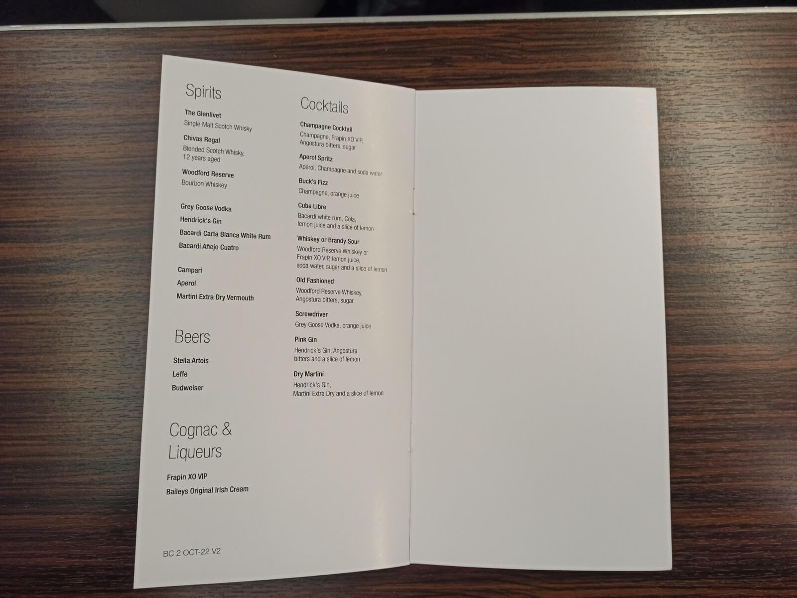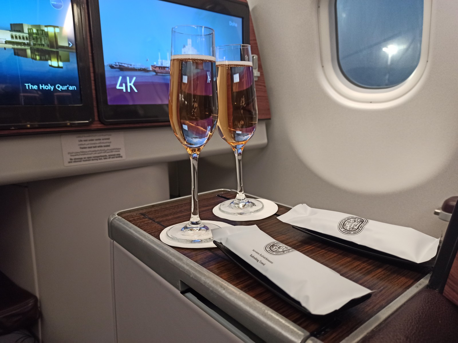 Am Sitz warteten bereits eine Decke, ein Kissen, die Kopfhörer, die Menükarten sowie eine Flasche Wasser. Kurz nachdem wir unsere Plätze eingenommen hatten, stellte sich die Flugbegleiterin bei uns vor. Sie erkundigte sich zunächst, ob wir bereits mit dem Sitz vertraut seien oder es einer Einweisung bedürfe. Anschließend fragte sie uns nach dem Begrüßungsgetränk und wir wählten beide die alkoholfreie, sektähnliche Variante namens “So Jenny”. Zum Begrüßungsgetränk wurde ein Erfrischungstuch ausgeteilt. Da sich unser Start ab Kathmandu aufgrund hohen Luftverkehrsaufkommens etwas verzögerte, blieb der Crew dann auch ausreichend Zeit, noch am Boden die Essens- und Getränkewünsche aller Business Class Passagiere aufzunehmen.