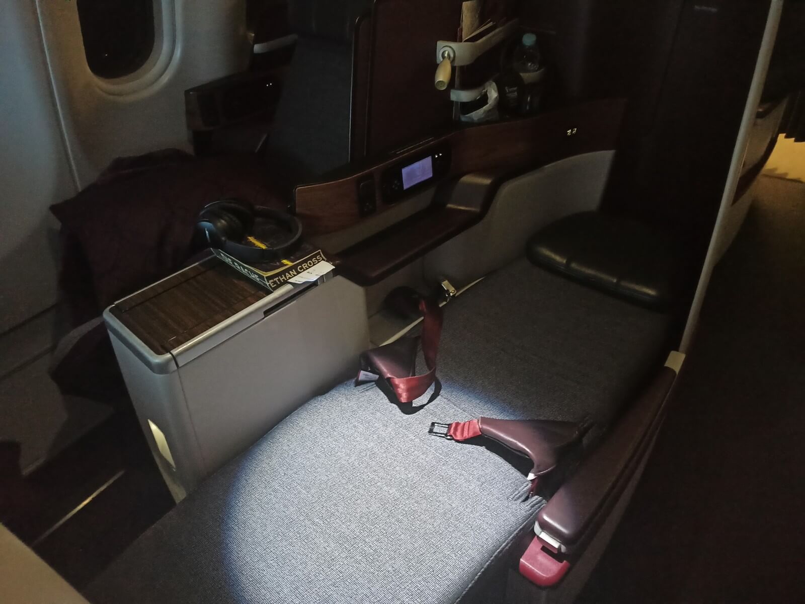 Die Gestaltung der Business Class Kabine im A330-300 hat mir ganz gut gefallen, versprüht jedoch nicht ansatzweise den Glanz der Qsuite. Der Sitzbezug ist in grau und die Armaturen und die Verkleidung teilweise in Bordeaux gehalten oder mit Holz verkleidet. Wie erwähnt, betraten wir das Flugzeug über die zweite Tür. Zwar war ich der erste Passagier an Bord, konnte aber dennoch keine Fotos von einer leeren Kabine machen. Bis ich den vorderen Teil des Flugzeugs erreichte, um die Kabine von vorne aufzunehmen, waren die anderen Fluggäste bereits nachgerückt.