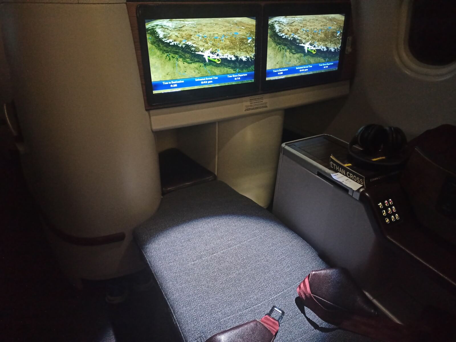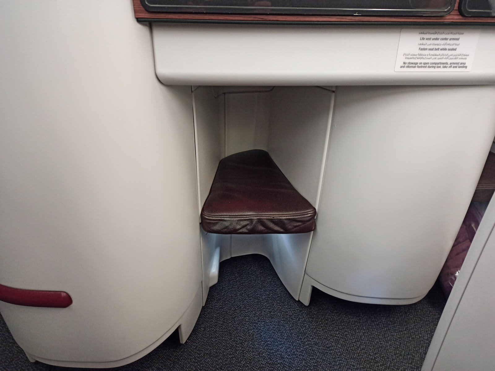 Der Aufbau des Sitzes ist wie folgt: Die äußere Armlehne am Gang ist höhenverstellbar. Auf der anderen Seite befinden sich auf Schulterhöhe eine kleine Ablage (mit Menükarten und Sicherheitskarte), ein Flaschenhalter und eine Leselampe. Daran schließt ein Sichtschutz zum Nachbarsitz an, den man teilweise ein- und ausfahren kann. Zwischen diesem Sichtschutz und der inneren Armlehne befinden sich der Controller für das Inflight Entertainment System, ein USB-Anschluss sowie der Anschluss für den Kopfhörer. Die Armlehne schließt mit dem Bedienelement des Sitzes ab. Es werden drei Schnellwahlfunktionen (Aufrecht, Loungeposition und flaches Bett) angeboten, zudem kann man den Sitz nach eigenem Wunsch verstellen. Die beiden Sitze trennt dann die mit Holz verkleidete Mittelkonsole, in der sich auch die ausziehbaren Tische sowie auf der Stirnseite, Richtung Bildschirme, die Steckdosen befinden. Der Tisch ist nicht in seiner Position verstellbar. Wer aufstehen will, muss den Tisch einklappen. An den Armlehnen und den Fächern der Tische kann man Abnutzungsspuren entdecken, für das Alter der Maschine ist die Abnutzung jedoch vertretbar. Die Ablagefläche in der Mitte reicht für zwei Smartphones oder ein Tablet, aber für einen Laptop wird es schon sehr knapp.