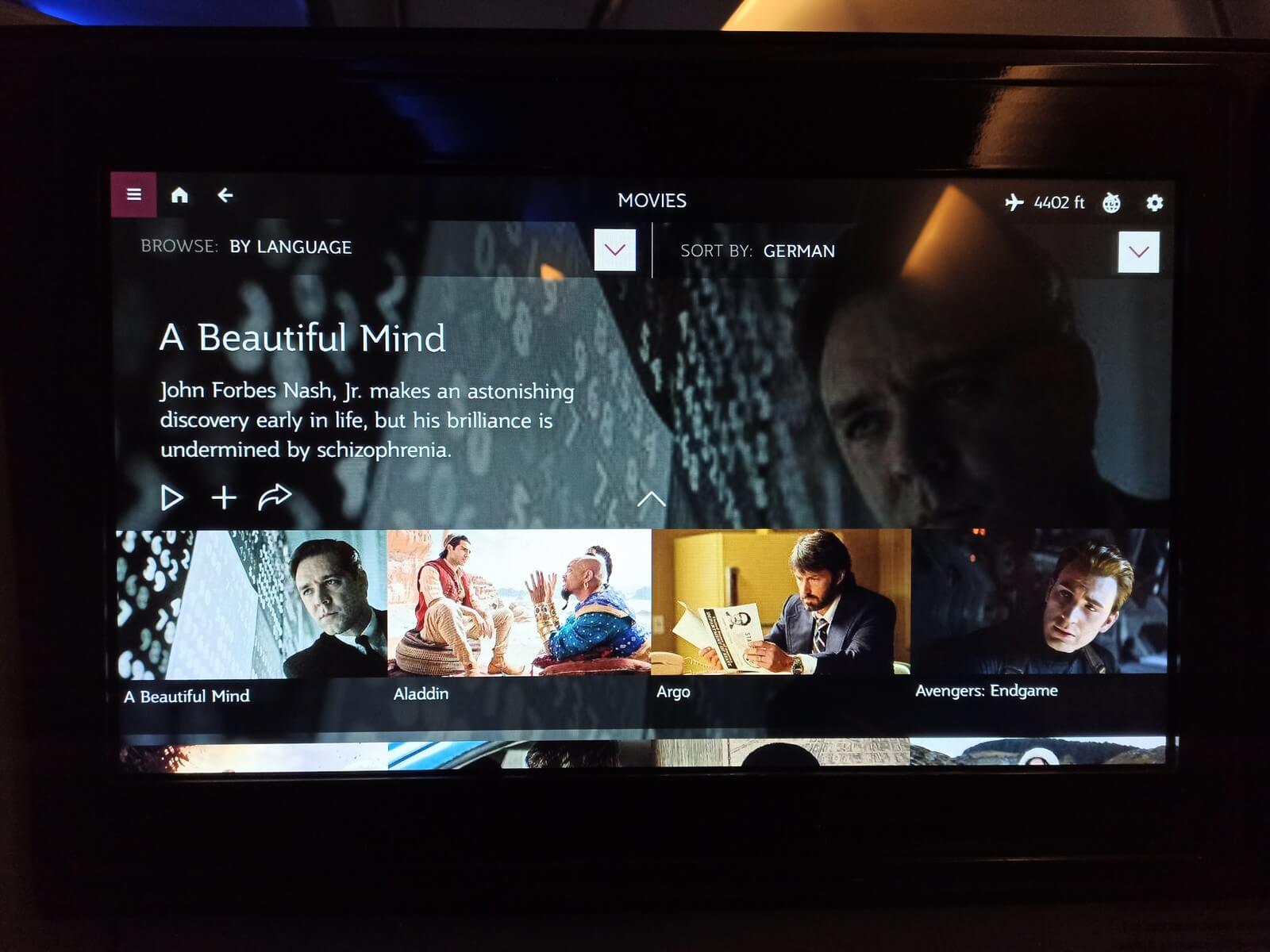 Den Monitor kann man bequem per Touchfunktion bedienen und das System reagiert schnell auf die Befehle. Den Business Class Passagieren bietet Qatar Airways auch im Airbus A330-300 Kopfhörer mit Noise-Cancelling-Funktion sowie den vollen Umfang des Oryx One Unterhaltungsprogramms mit einer sehr großen Auswahl an Filmen, Serien, Dokumentationen, Hörbüchern, Musikalben und Fluginformationen. Man kann auch gezielt nach Filmen filtern, die in Deutsch verfügbar sind. Das Entertainment-System von Qatar Airways gehört sicherlich zu den besten seiner Art.