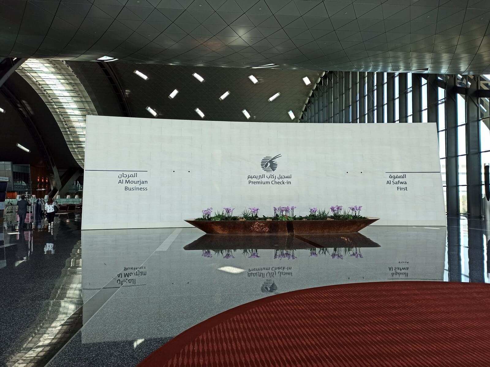 Am Hamad International Airport in Doha, dem Drehkreuz von Qatar Airways, gibt es einen eigenen Eingang für Passagiere der First und Business Class. Bereits vor dem Terminalgebäude stehen Mitarbeiter bereit, um das Gepäck entgegenzunehmen und dies an die Check-In-Schalter zu bringen. First Class Passagiere wenden sich nach dem Betreten des Terminals nach rechts und Business Class Passagiere nach links. Im Business Class-Bereich erwarteten uns Check-In-Schalter im Qatar Airways-Branding sowie Sitzgelegenheiten. Der Check-In-Prozess verlief problemlos und wir gelangten nach wenigen Schritten zur eigenen Sicherheitskontrolle dieses Bereichs. Beim Check-In als auch an der Sicherheitskontrolle waren wir die einzigen Passagiere. Insgesamt war auffällig, wie wenig Reisende sich mittags am Flughafen Doha tummeln. Kein Vergleich zu den Stoßzeiten rund um Mitternacht.