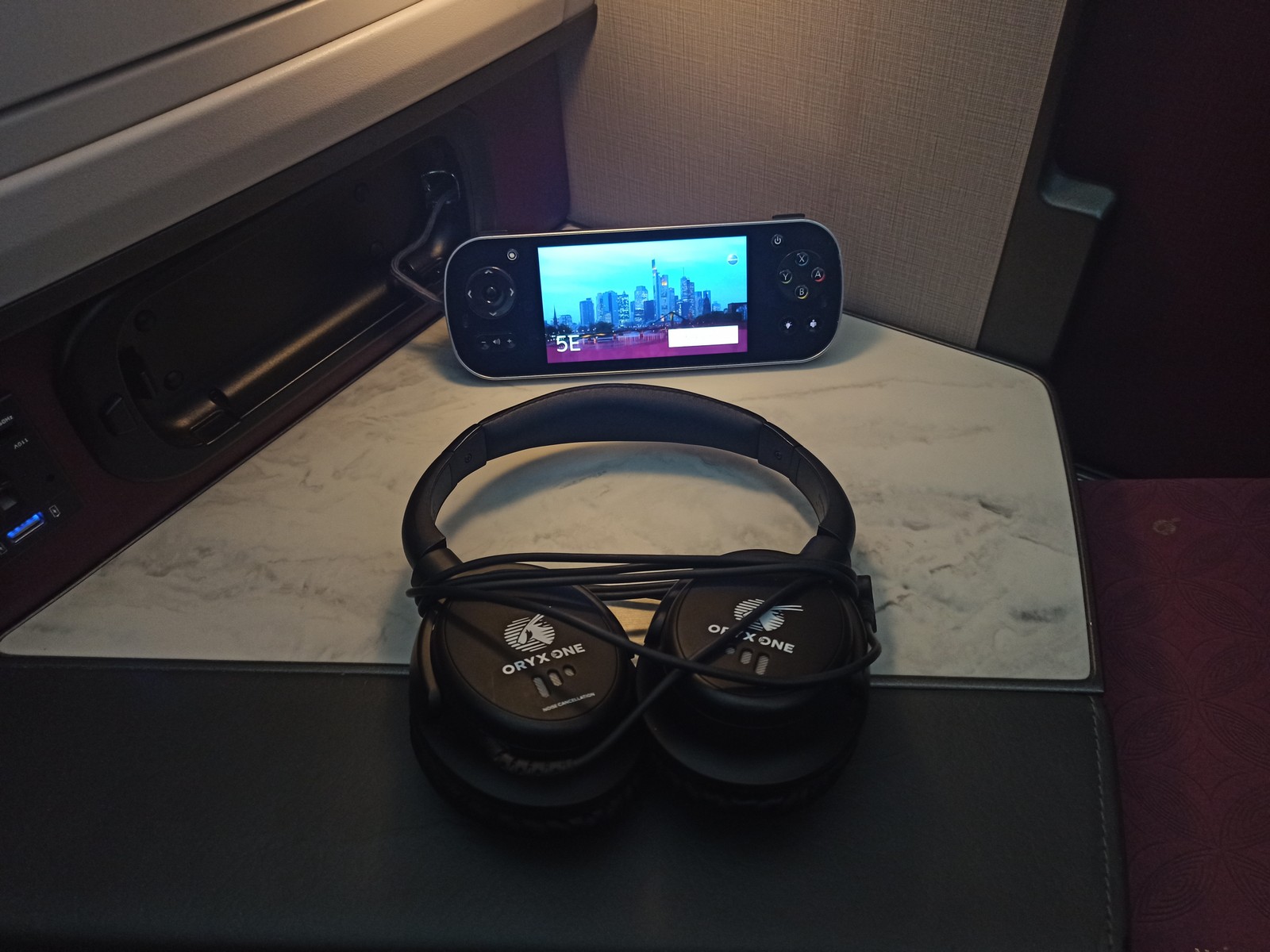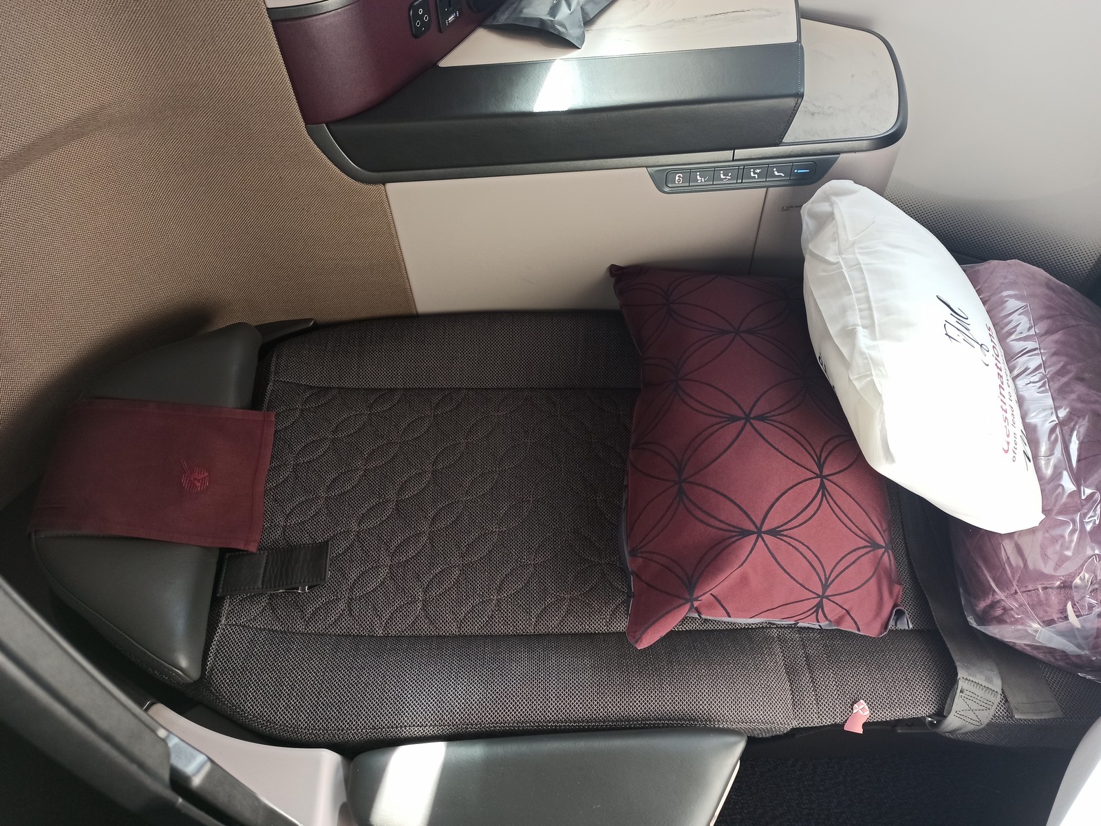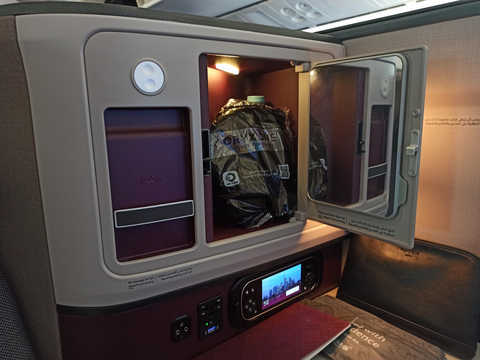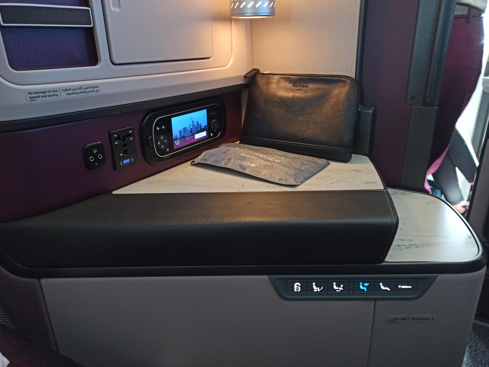 Auf dem Sitz bzw. auf der Ablage warteten bereits eine Decke, zwei Kissen, ein Amenity Kit und ein Hygiene-Kit sowie im Staufach eine Flasche Wasser und die Kopfhörer. Der Aufbau des Sitzes ist wie folgt: Auf einer Seite des Sitzes befinden sich die Ablagefläche, ein verschließbares Staufach zum Aufklappen mit integriertem Spiegel auf Kopfhöhe, eine Lampe (nicht verstellbar), eine kleine Leselampe, die Halterung für das Handy (mit kontaktloser Ladefunktion), USB-Anschlüsse und Steckdose, der Controller für das Entertainmentsystem und das Bedienelement für den Sitz. Die Halterung für die Sicherheitskarten ist neben dem persönlichen Bildschirm angebracht. Unter dem Bildschirm folgen der ausziehbare Tisch und die Fußablage.