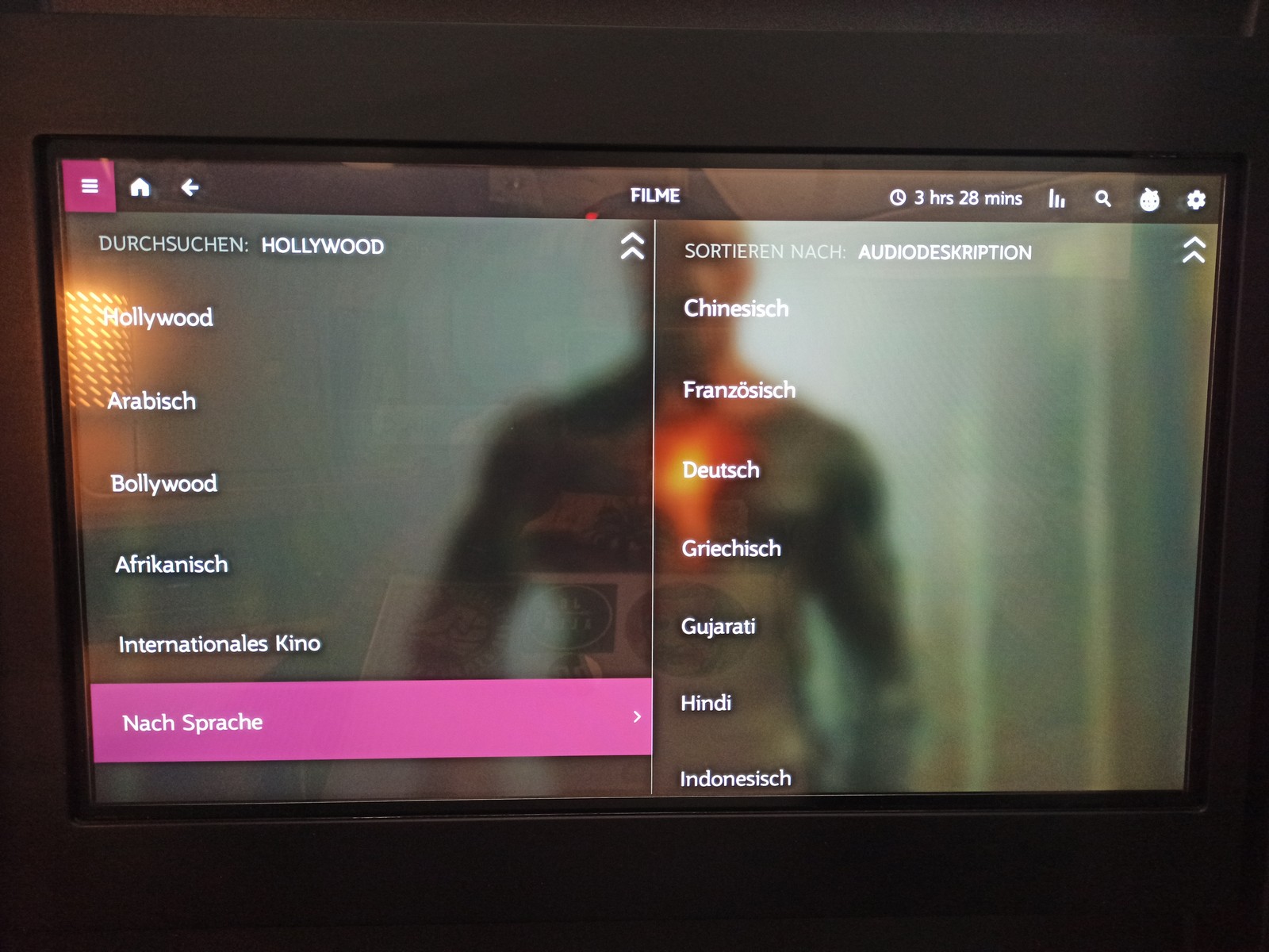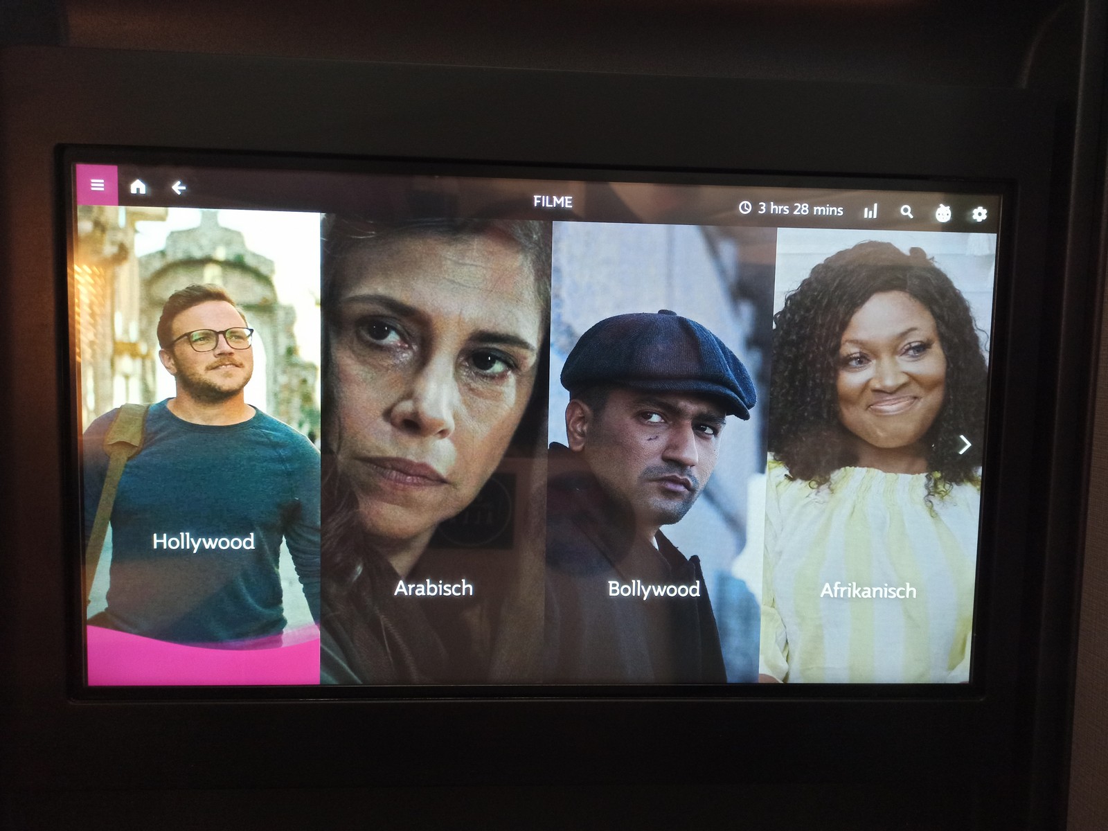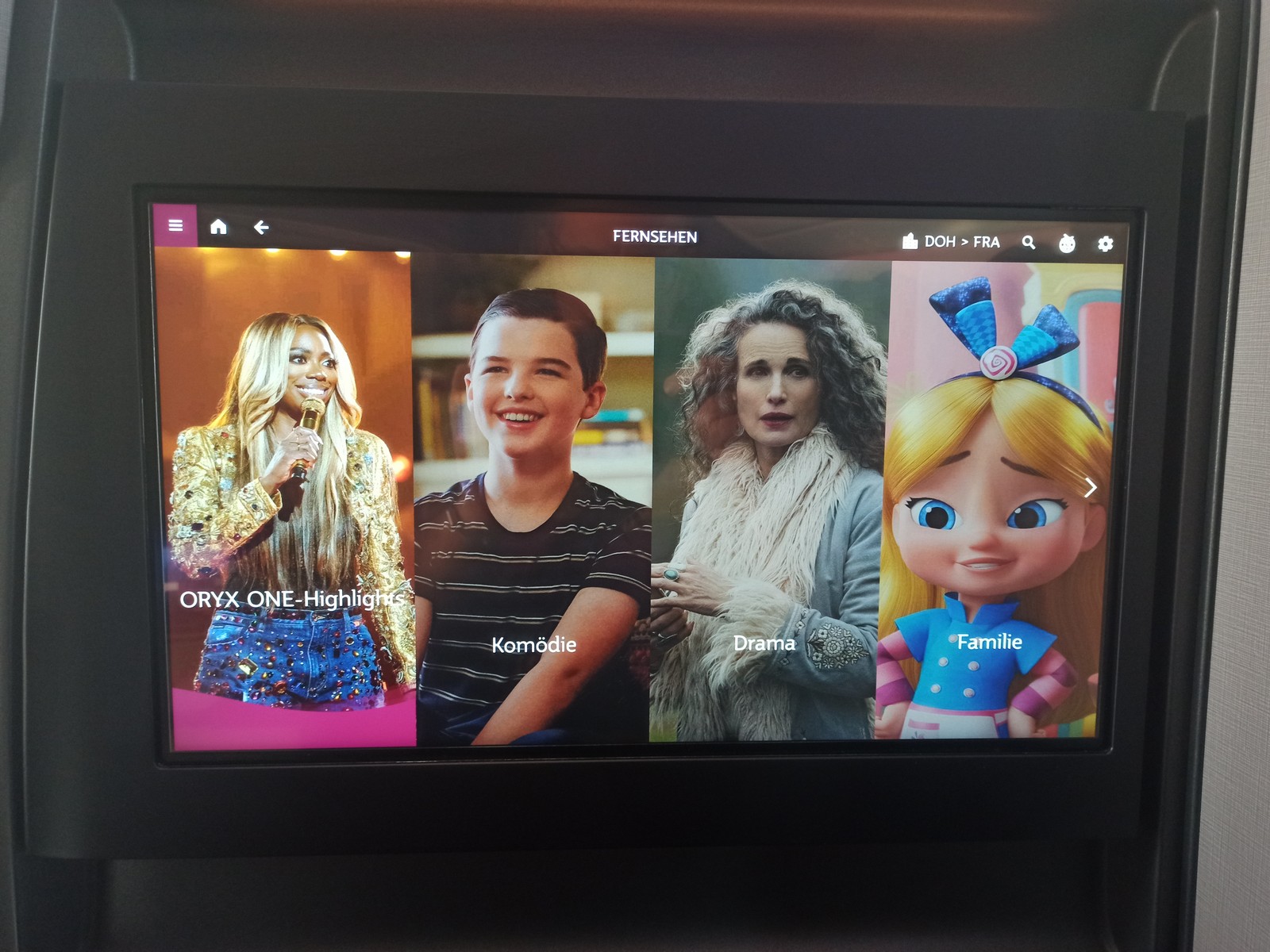 Den Monitor kann man bequem per Touchfunktion bedienen und das System reagiert schnell auf die Befehle. Ihren Business Class Passagieren bietet Qatar Airways Kopfhörer mit Noise-Cancelling-Funktion sowie das Oryx One-Unterhaltungsprogramm mit einer sehr großen Auswahl an Filmen, Serien, Dokumentationen, Hörbüchern, Musikalben und Fluginformationen. Man kann auch gezielt nach Filmen filtern, die in Deutsch verfügbar sind. Das Entertainment-System von Qatar Airways gehört sicherlich zu den besten seiner Art. Gut gefallen haben mir die Außenkameras.