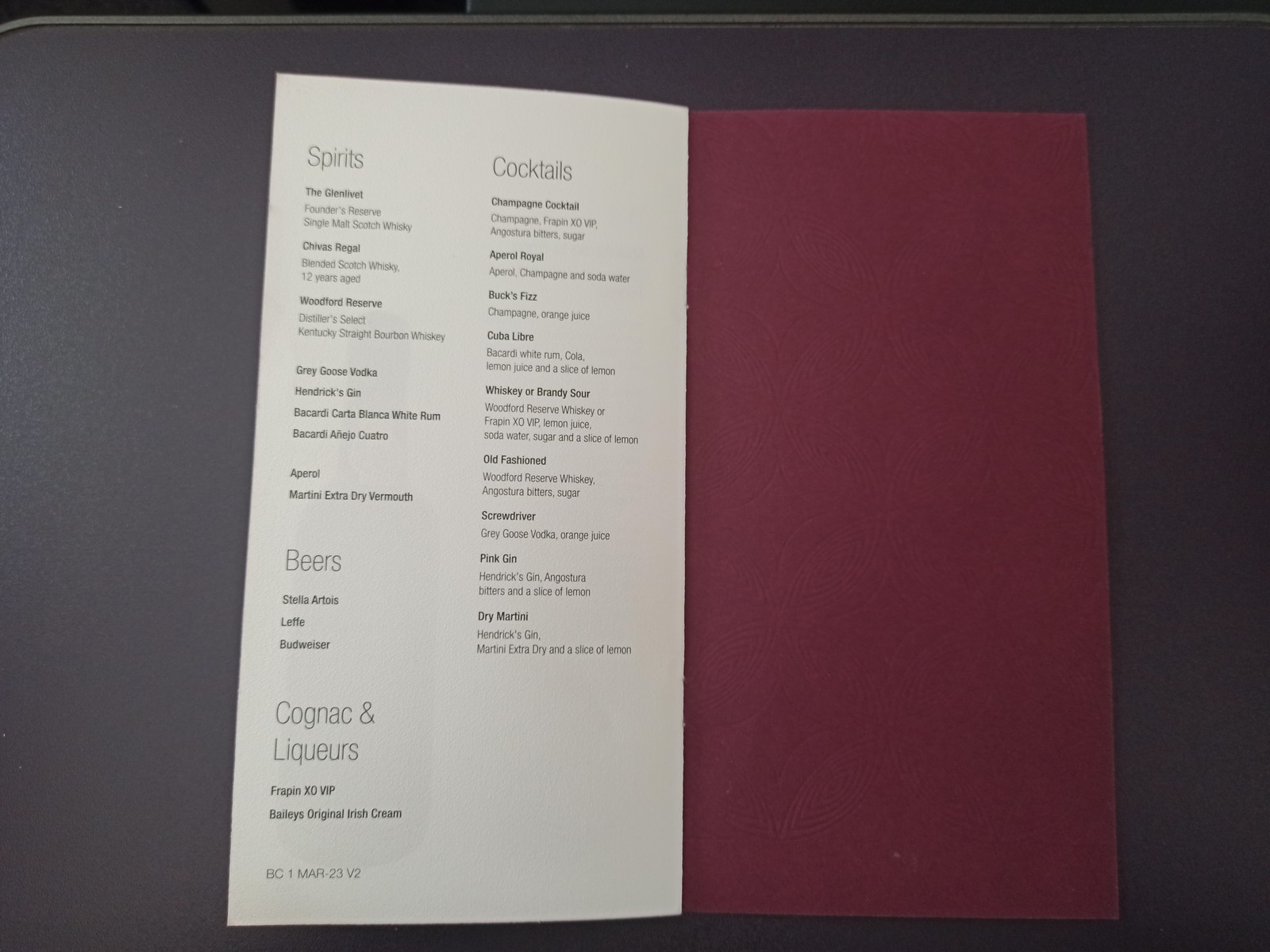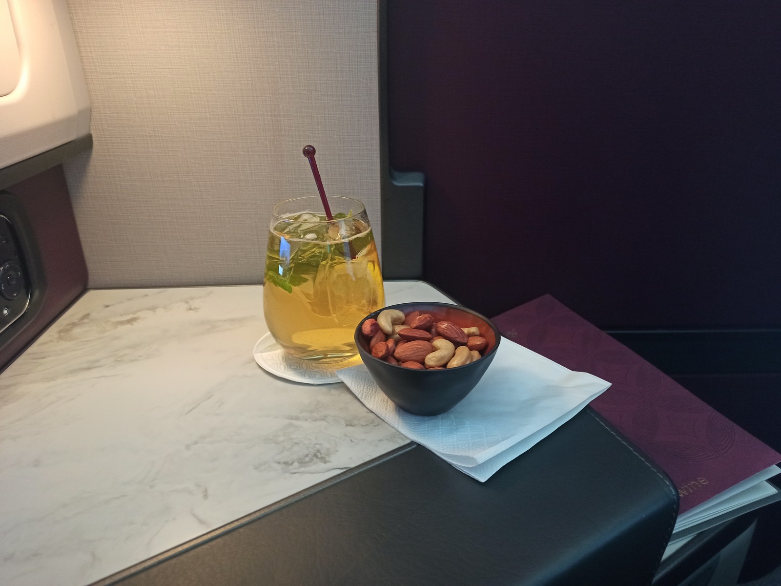 Am Sitz warteten bereits eine Decke, zwei Kissen, das Amenity Kit, die Kopfhörer sowie eine Flasche Wasser. Kurz nachdem wir unsere Plätze eingenommen hatten, stellte sich die Flugbegleiterin bei uns vor und verteilte die Menükarten. Zum Begrüßungsgetränk wurde ein Erfrischungstuch ausgeteilt. Vor dem Start wurden dann schon die Essens- und Getränkewünsche aufgenommen. Die Flugbegleiter waren sehr offen und freundlich und wir wurden vom Purser persönlich Willkommen geheißen. Kurz nach dem Start gab es warme Nüsse zusammen mit unseren bevorzugten Mocktails (Pineapple Punch und Apple Cooler) und kurz darauf folgte schon das eigentliche Essen.