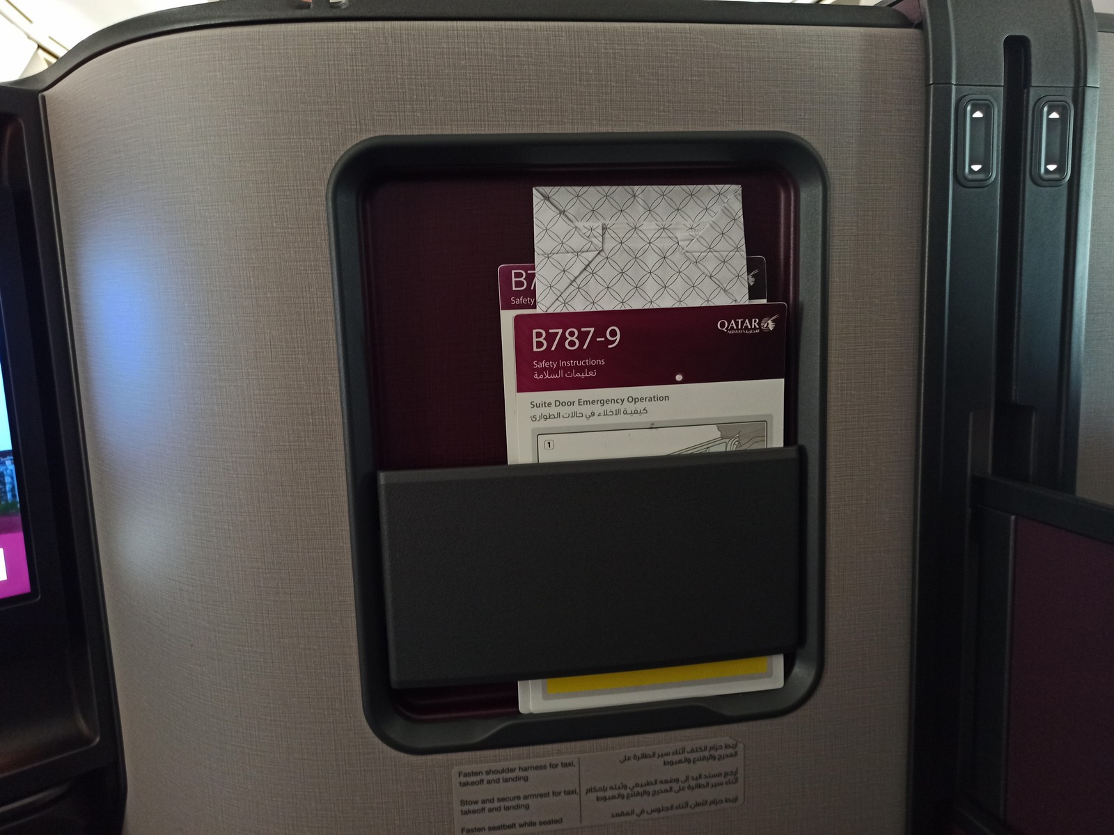 Für mehr Privatsphäre bietet die Business Class von Qatar Airways in der Boeing 787-9 allen Passagieren eine Tür. Zwischen den Mittelsitzen ist zudem ein verstellbarer Sichtschutz angebracht, der per Knopfdruck bedient wird. Soll der Sichtschutz nach oben, muss nur ein Passagier den jeweiligen Knopf drücken, soll der Sichtschutz nach unten, müssen sich die Reisenden einig sein und den Knopf gleichzeitig betätigen. Die Tür der Suite lässt sich einfach schließen, es bleibt jedoch immer ein kleiner Spalt geöffnet, wie die unteren Bilder zeigen. Zudem ist der Sichtschutz nicht wirklich hoch und auf jeden Fall niedriger als bei der Qsuite.