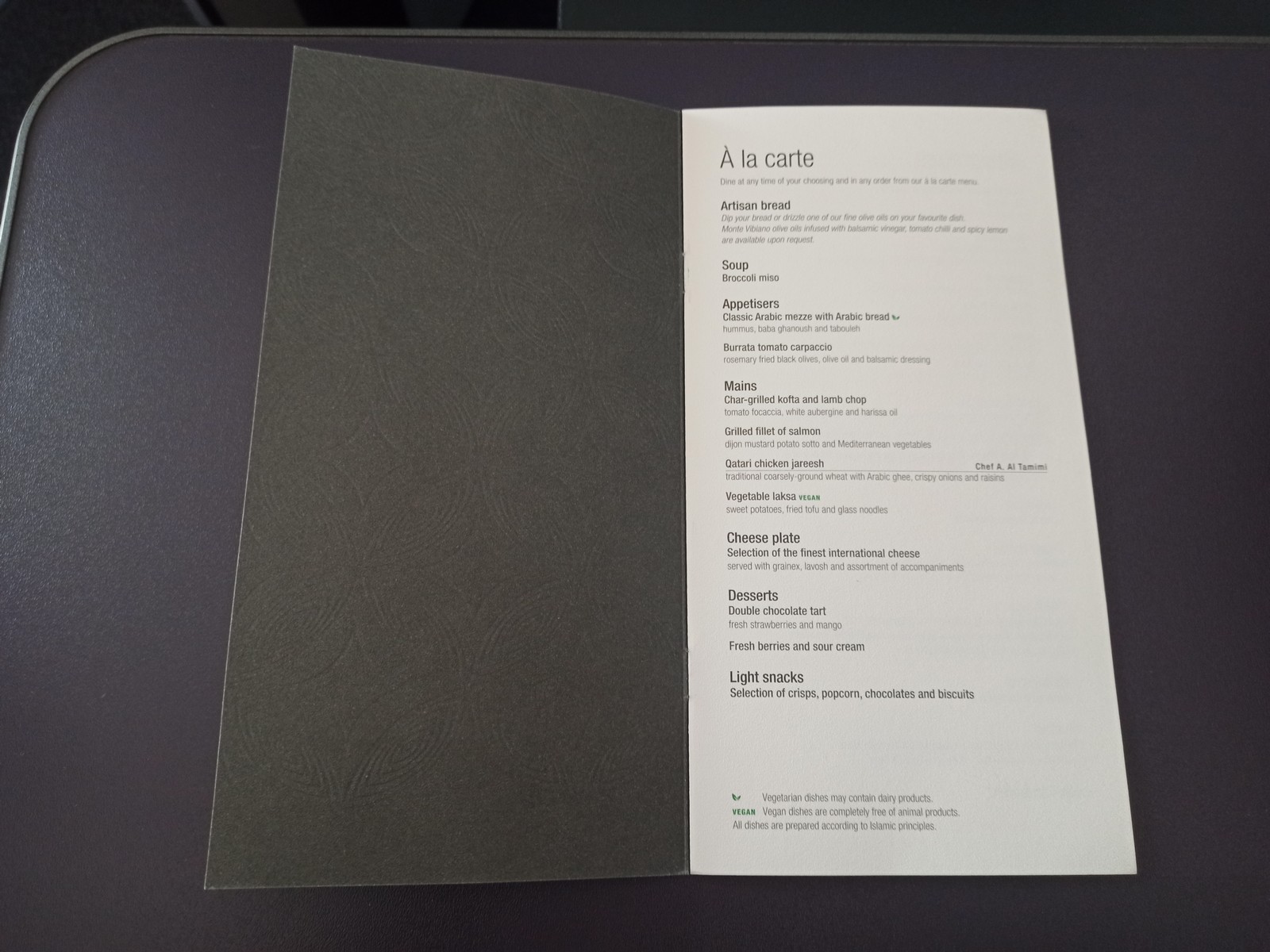 Als Vorspeise gab es für uns diesmal nicht das Arabic Mezze, das man als Signature Starter von Qatar Airways betrachten kann, sondern ein Burrata Tomato Carpaccio. Als Hauptspeise wählten wir einmal den Lachs mit Potato Sotto und mediterranem Gemüse sowie einmal die Gemüse-Laksa. Zum Dessert genehmigte ich mir die Double Chocolate Tarte und Lisa die Beeren mit Sour Cream. Der Geschmack und die Präsentation der Gerichte waren wie gewohnt hervorragend.