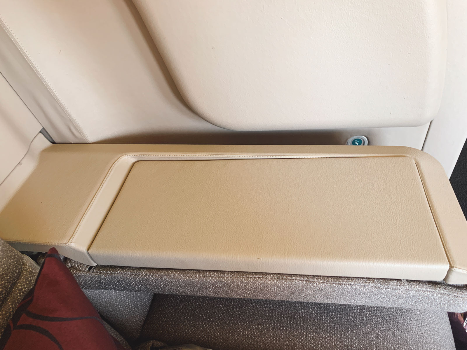 Sowohl die Kabine als auch die Sitze in der ehemaligen Cathay 777 sind schon etwas älter, wohlgemerkt aber in beinahe tadellosem Zustand. Am Sitz selbst merkt man nichts von dem Alter, beim Drumherum jedoch fällt hier und da etwas auf, wie ihr sehen werdet. Die Sitze sind keine Suiten, aber bei einer 1-1-1 Bestuhlung so privat wie es wohl nur sein kann – eine Türe habe ich absolut nicht vermisst. Im Grunde sind Sitze und Kabine grau/beige, jedoch macht die seitliche Ablage in Holzoptik durchaus etwas her und bietet einen guten Kontrast zum Rest. Wie anhand der Bilder unschwer zu erkennen ist, sind die Sitze extrem ausladend – im positiven Sinne! Mit über 90 Zentimeter Breite sind sie immerhin so breit wie ein Einzelbett, jedenfalls bis zu den Beinen.