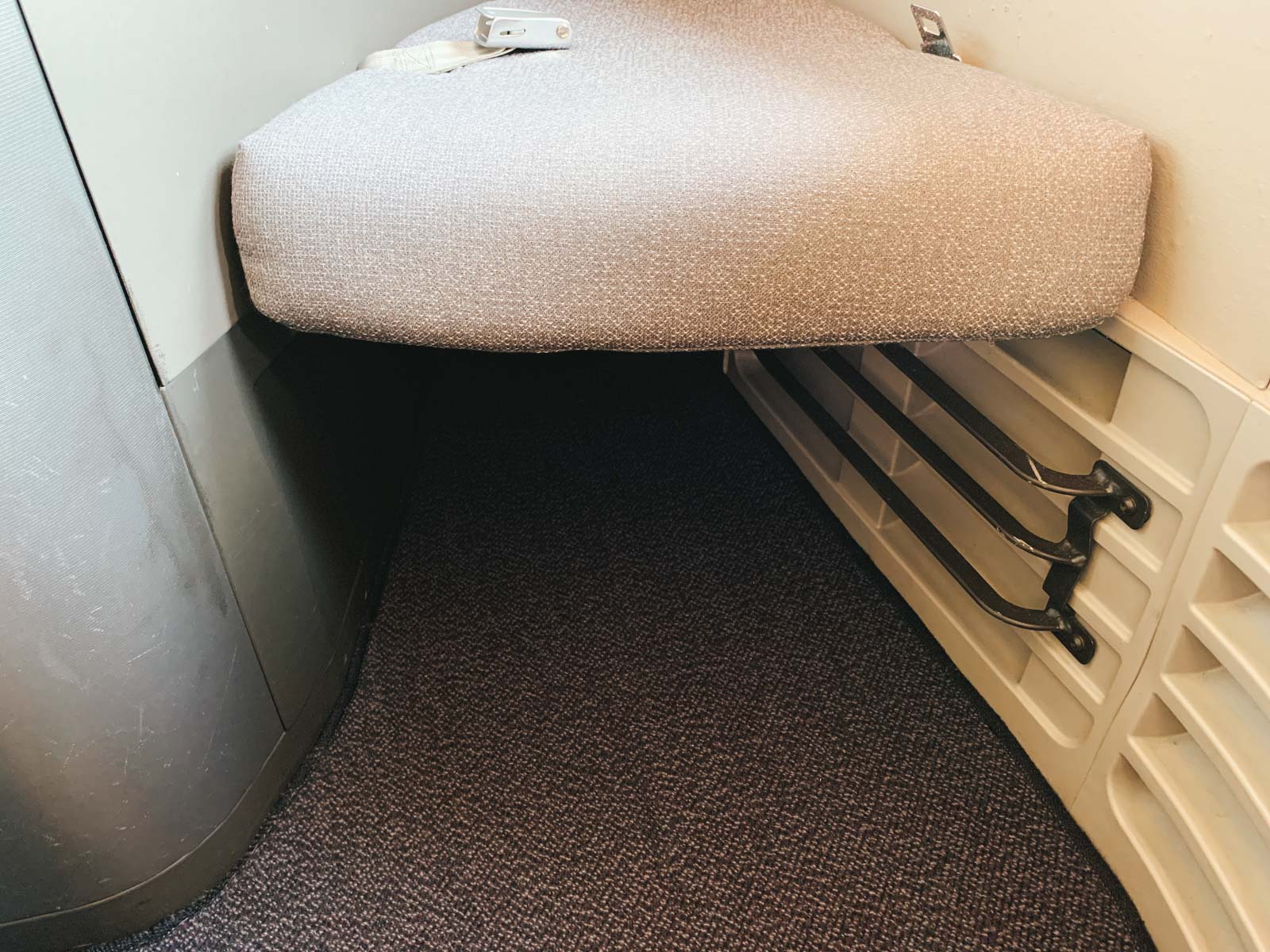 Die Kabine ist relativ einfarbig in verschiedenen Grautönen gehalten, was auch auf die Sitze selbst zutrifft. Farbakzente werden durch die hölzernen Seitenablagen bzw. durch die roten Kissen/Bettdecken und Kopfstützenbezüge gesetzt. Nichts Ausgefallenes oder Modernes, aber Altbewährtes und damit völlig in Ordnung. Was schnell auffällt: Es gibt keinerlei Overhead Bins. Das Gepäck wird direkt am Sitz im Schrank verstaut, dazu später mehr. Das, was dennoch relativ weit in Kabinenmitte ragt und Overhead Bins ähnelt, ist der Crew Rest, welcher in diesem Fall über eine Treppe hinter dem Vorhang erreichbar ist.