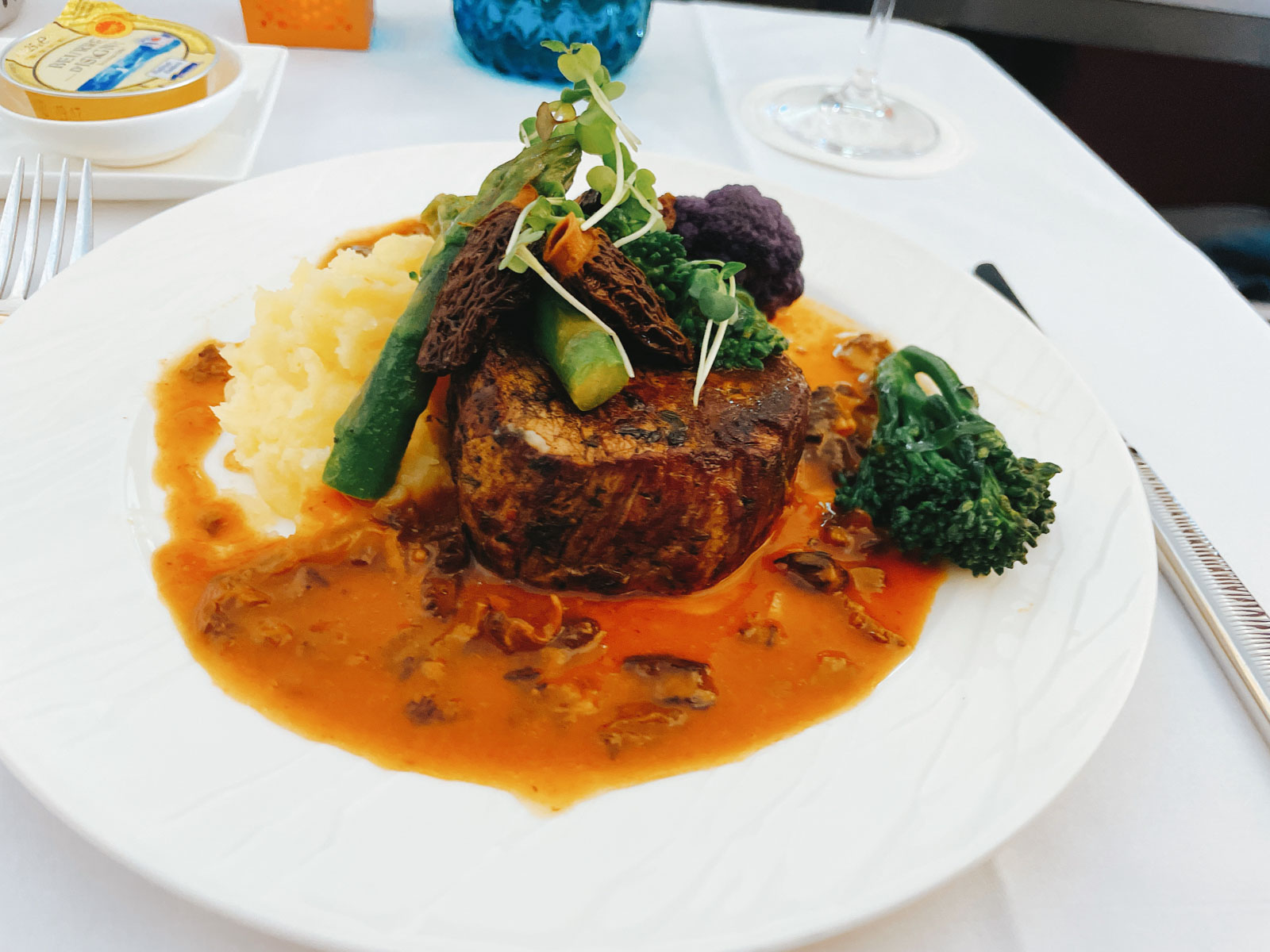 Die Vorspeise habe ich dafür umso besser in Erinnerung, denn es gab einen Teller voll mit Kaviar und Beilagen. Während Kaviar für sich allein eher langweilig schmeckt, war ich überrascht wie gut er mit Blinis/Zwieback, Ei und Zwiebeln ist! Nichts für jeden Tag, aber definitiv eines der Highlights auf meinem Flug.