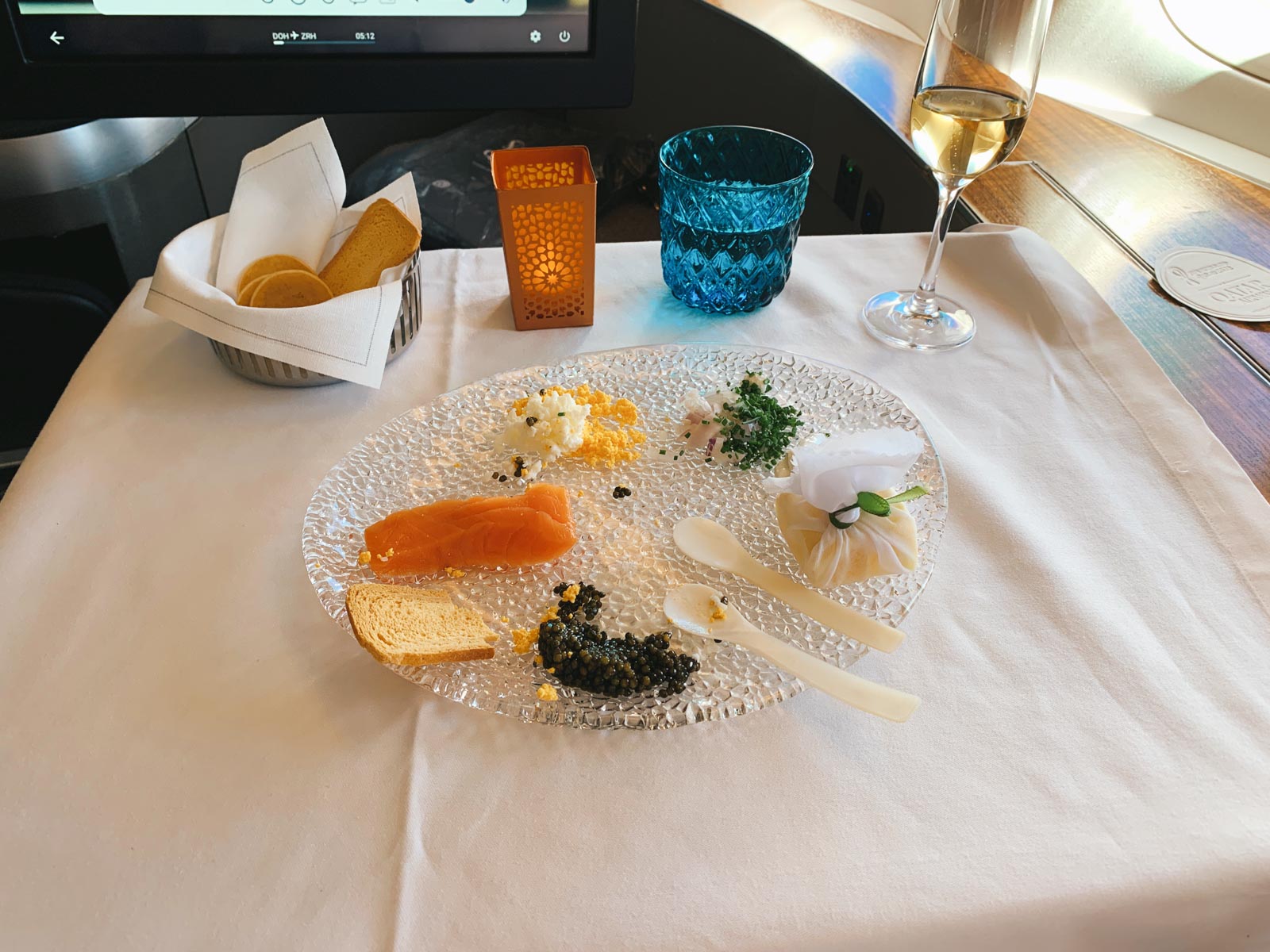 Nach einem sehr langen Taxi und dem Take-Off gab es dann eine weitere Runde Champagner, zusammen mit ein paar gewärmten Mandeln als Snack. Bereits am Boden wurde unsere Bestellung für das Mittagessen aufgenommen, und nach dem Erreichen der Reiseflughöhe der Tisch eingedeckt. Dieser bietet genügend Platz für das Festmahl, das Qatar Airways hier serviert – Tischdeko inklusive.