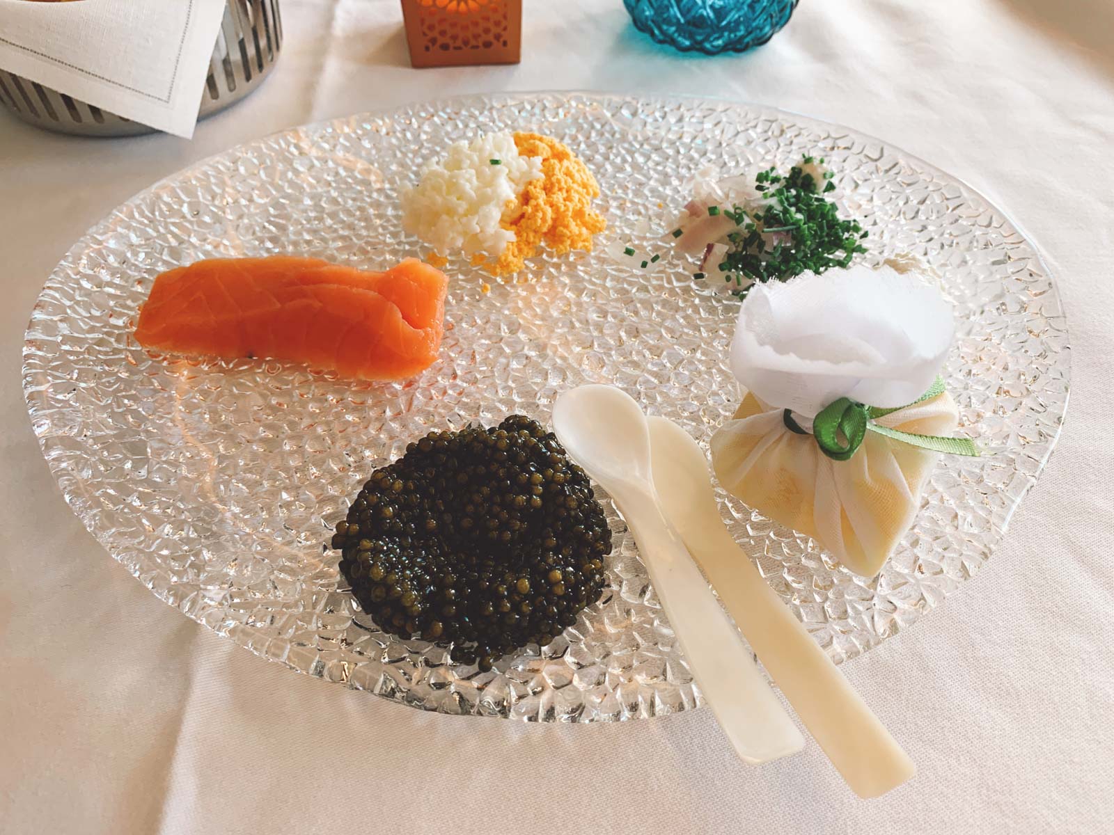 Kaum war der Tisch eingedeckt und der Brotkorb mit Salz, Pfeffer und Olivenöl gebracht, ging es schon los mit einem Amuse Bouche – was genau, weiß ich leider nicht mehr, nur, dass es aus dem Meer kam ;)
