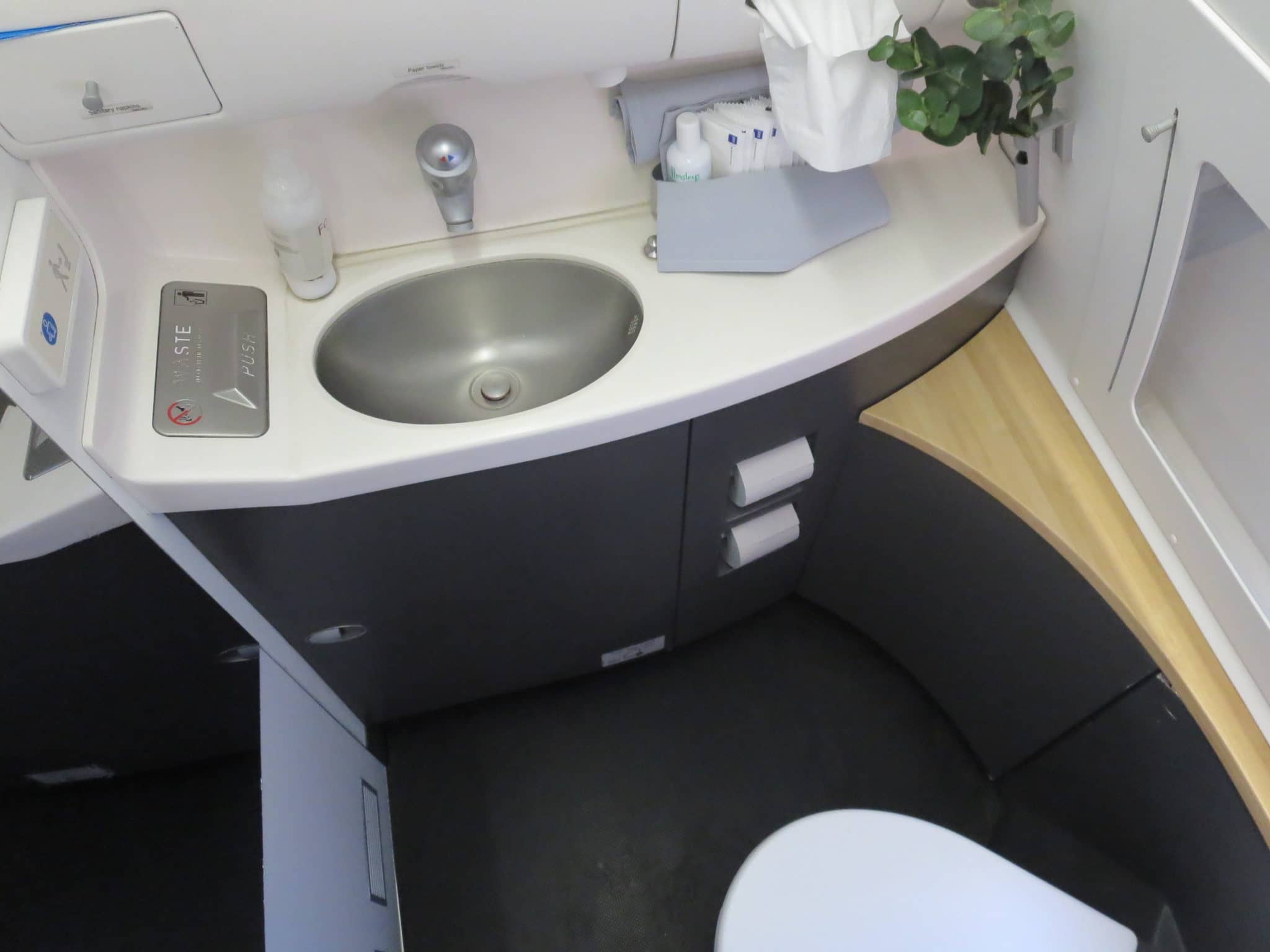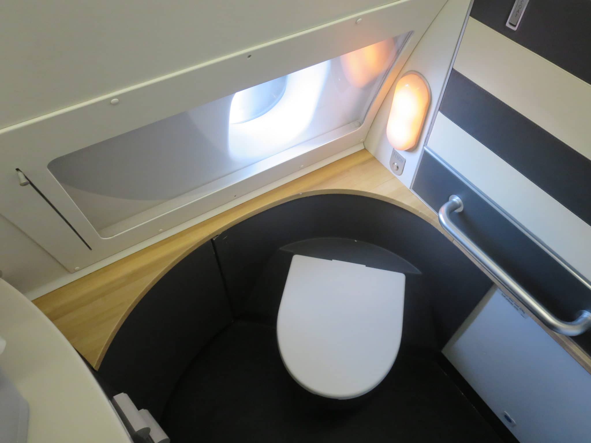 Das Bad an Bord des SAS A340 macht insgesamt einen sehr guten Eindruck. Man greift hier das Design der Kabine auf. Holzelemente machen das Bad etwas ansprechender als bei anderen Airlines. Ein weiteres Plus ist auch das Fenster. Ansonsten handelt es sich aber um ein normales Bad ohne besondere Features. Hier sind ein paar Eindrücke.