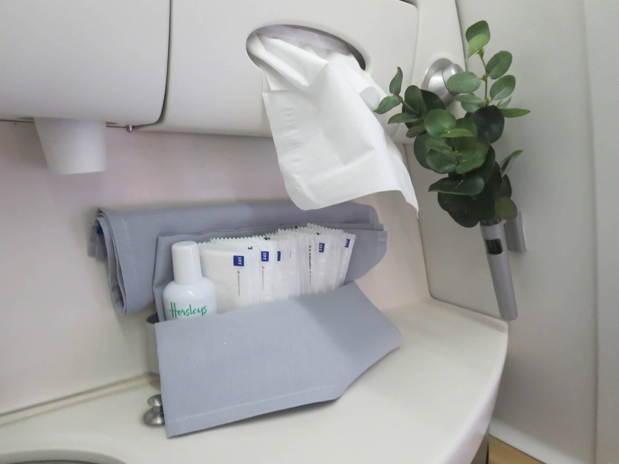 Beim Amenity Kit liefert SAS einen kleinen Stoffbeutel mit Reißverschluss. Im Innern finden sich eine Augenmaske, Socken, Ohrstöpsel, Zahnbürste und Zahnpasta, sowie Lippenbalsam und Creme von REN – auf einem Tagflug mehr als ausreichend.