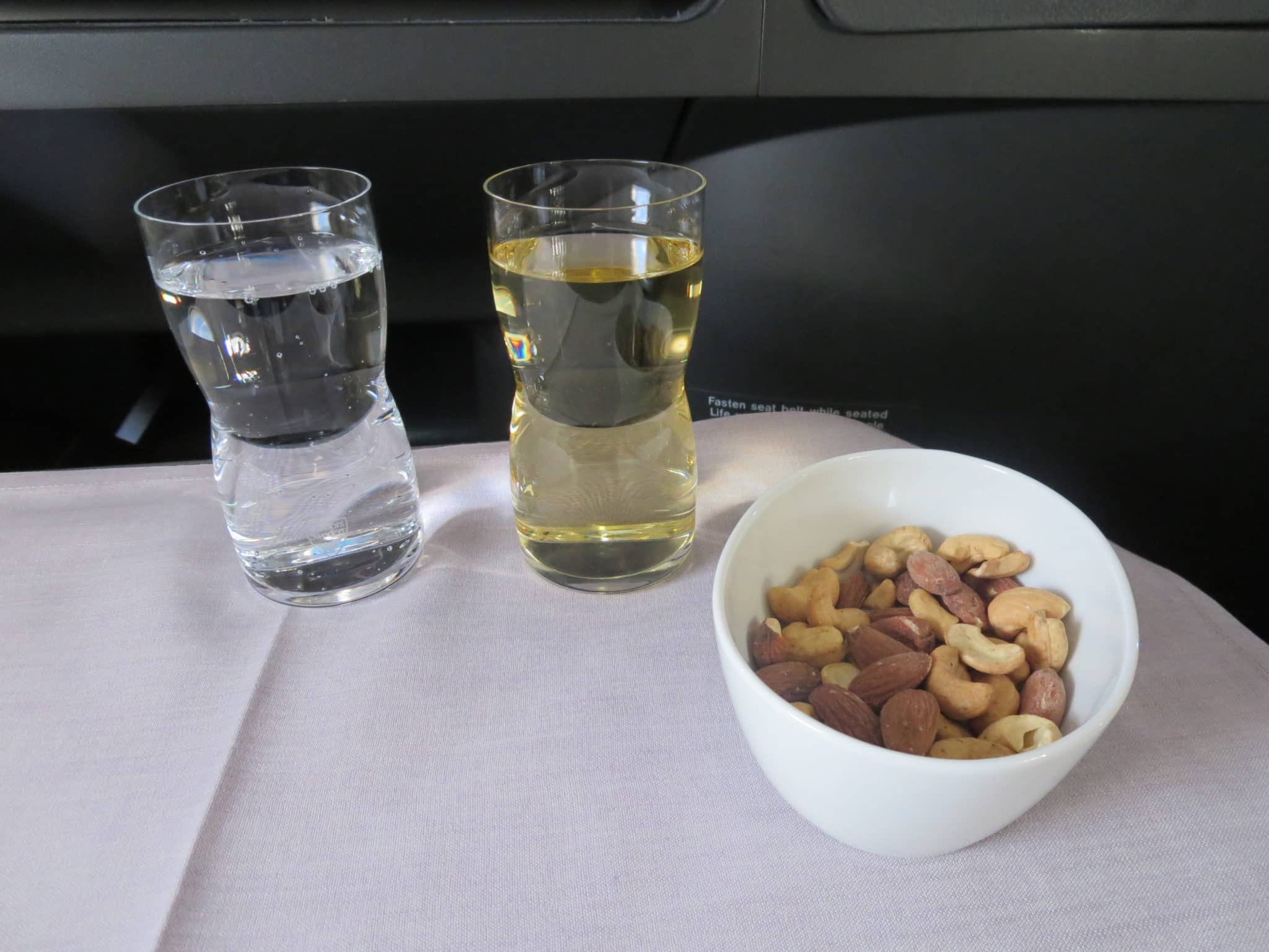 Kurz nach dem Start ging es dann mit einer Schale warmer Nüsse weiter. Auch Getränke wurden nochmals ausgeschenkt. Ich entschied mich für einen Weißwein und Wasser.