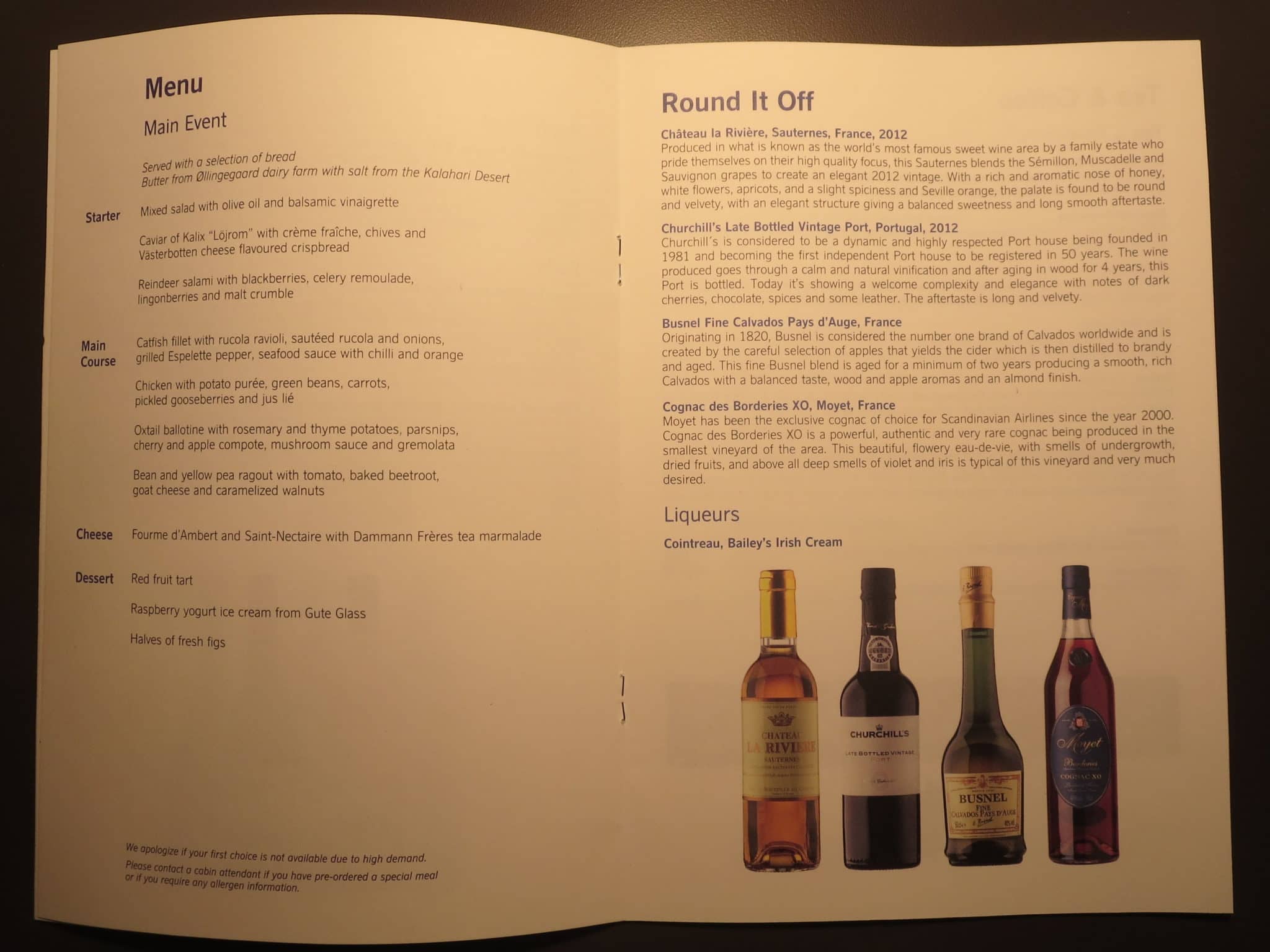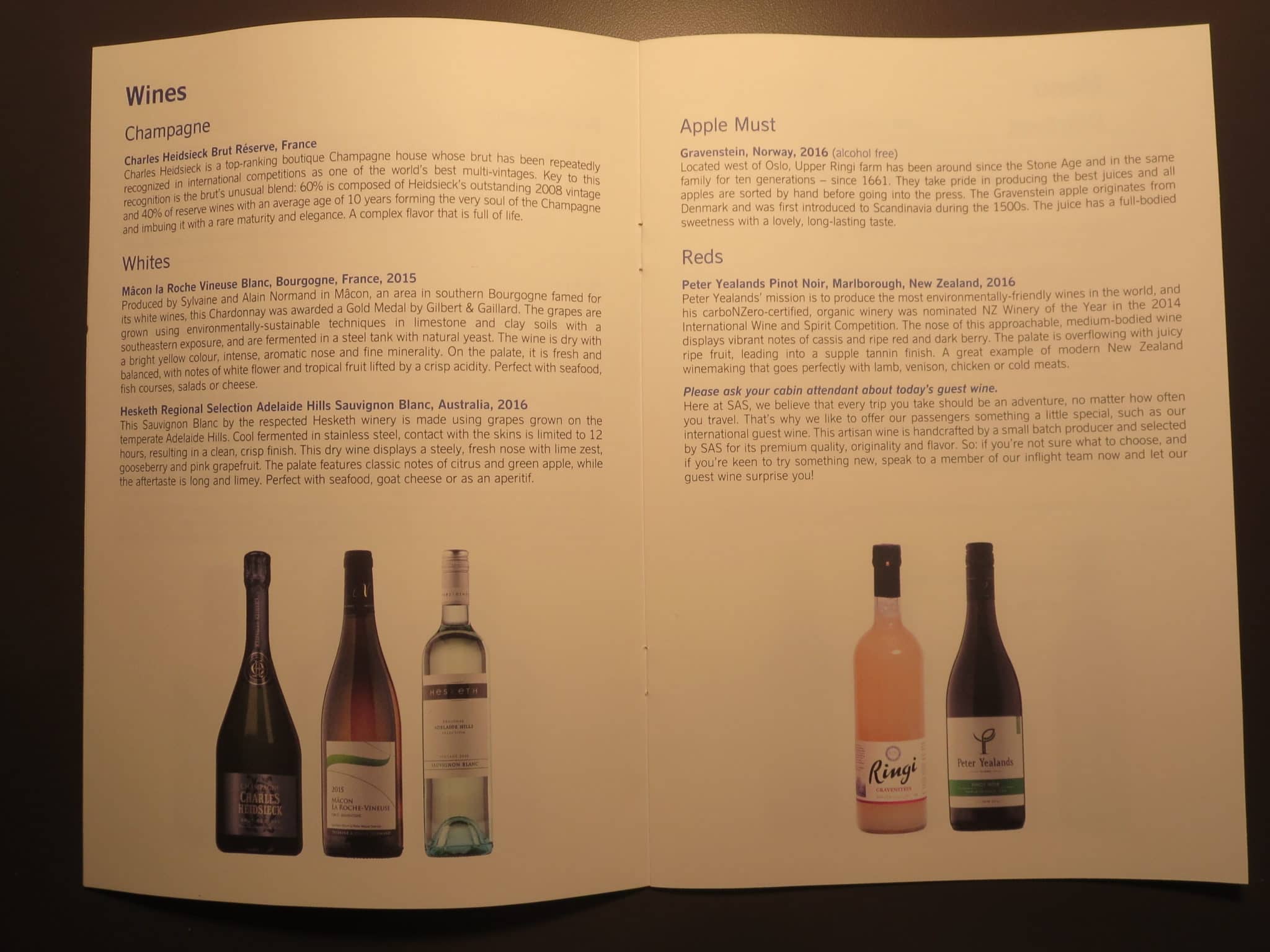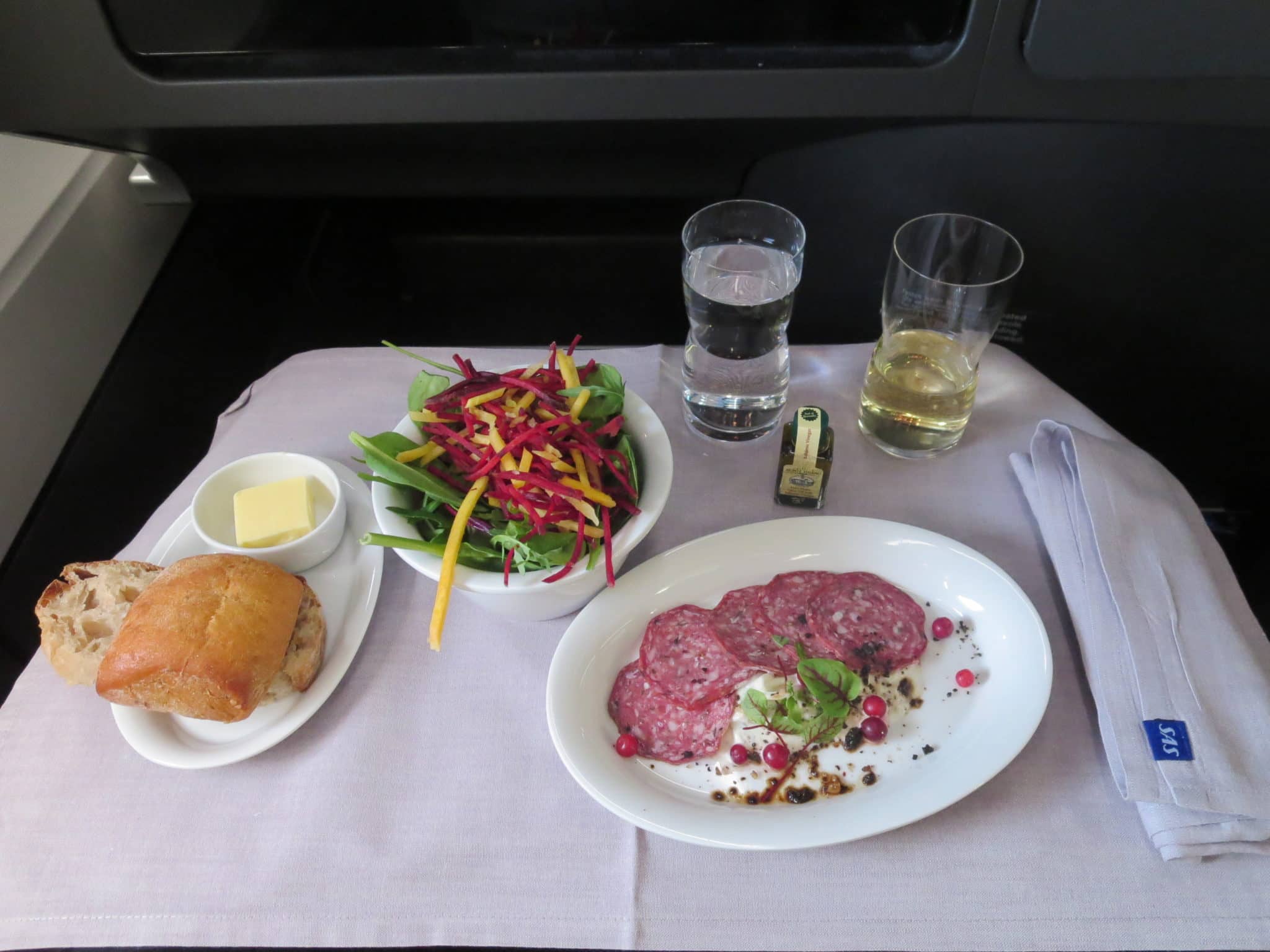 Der Essensservice in der SAS Business Class lief recht zügig und effizient ab. Zur Begrüßung gab es zunächst einen Champagner und auch die Menükarte wurde direkt mit ausgehändigt. Zur Auswahl standen mehrere Vorspeisen, darunter Rentier Salami und Kaviar, sowie vier Hauptspeisen. Hier die vollständige Menükarte: