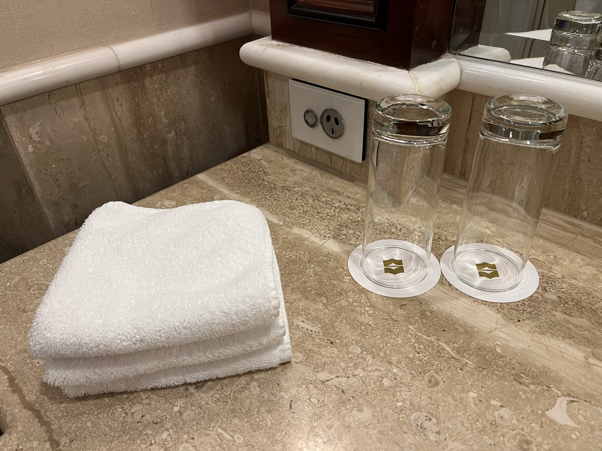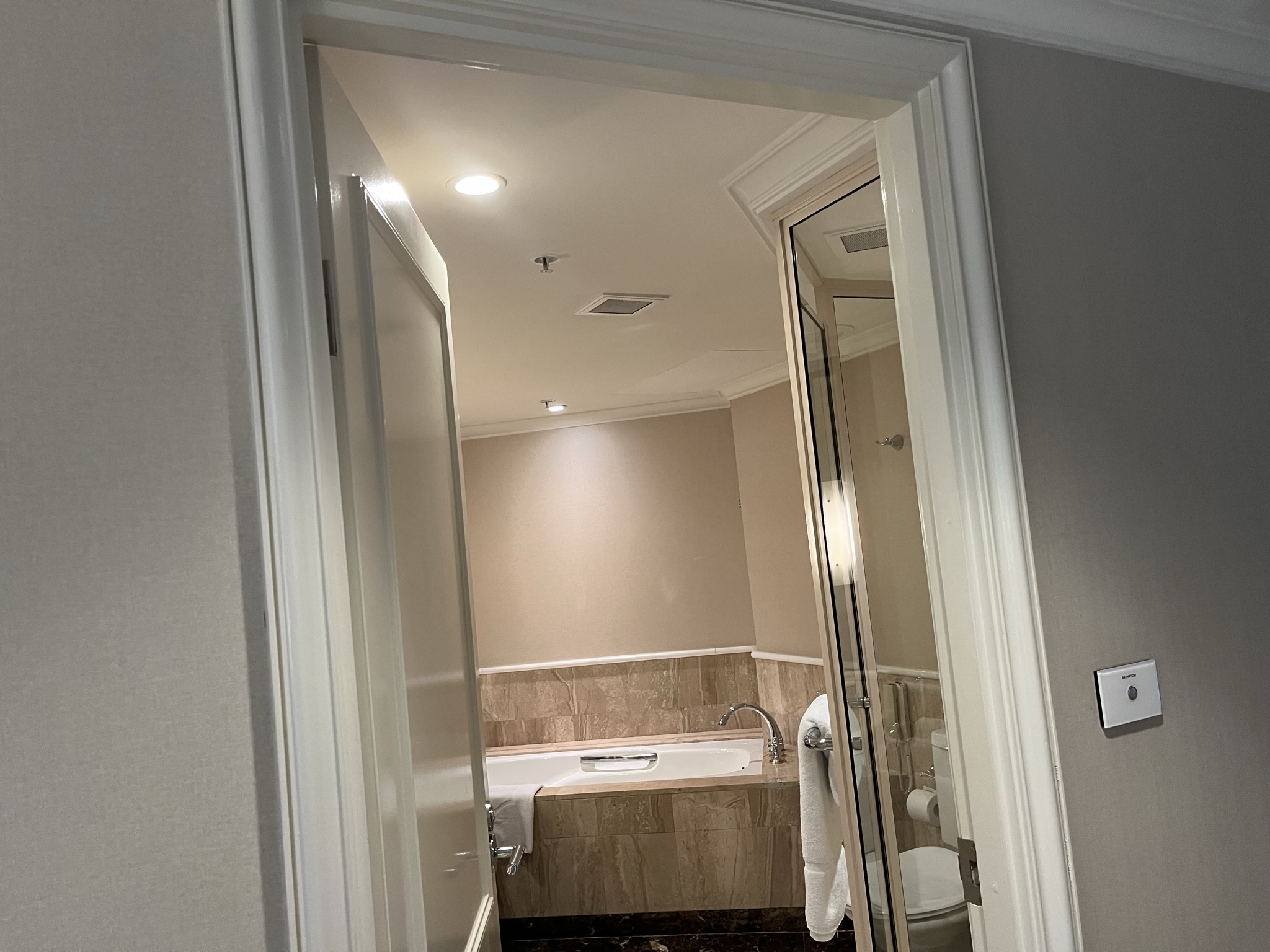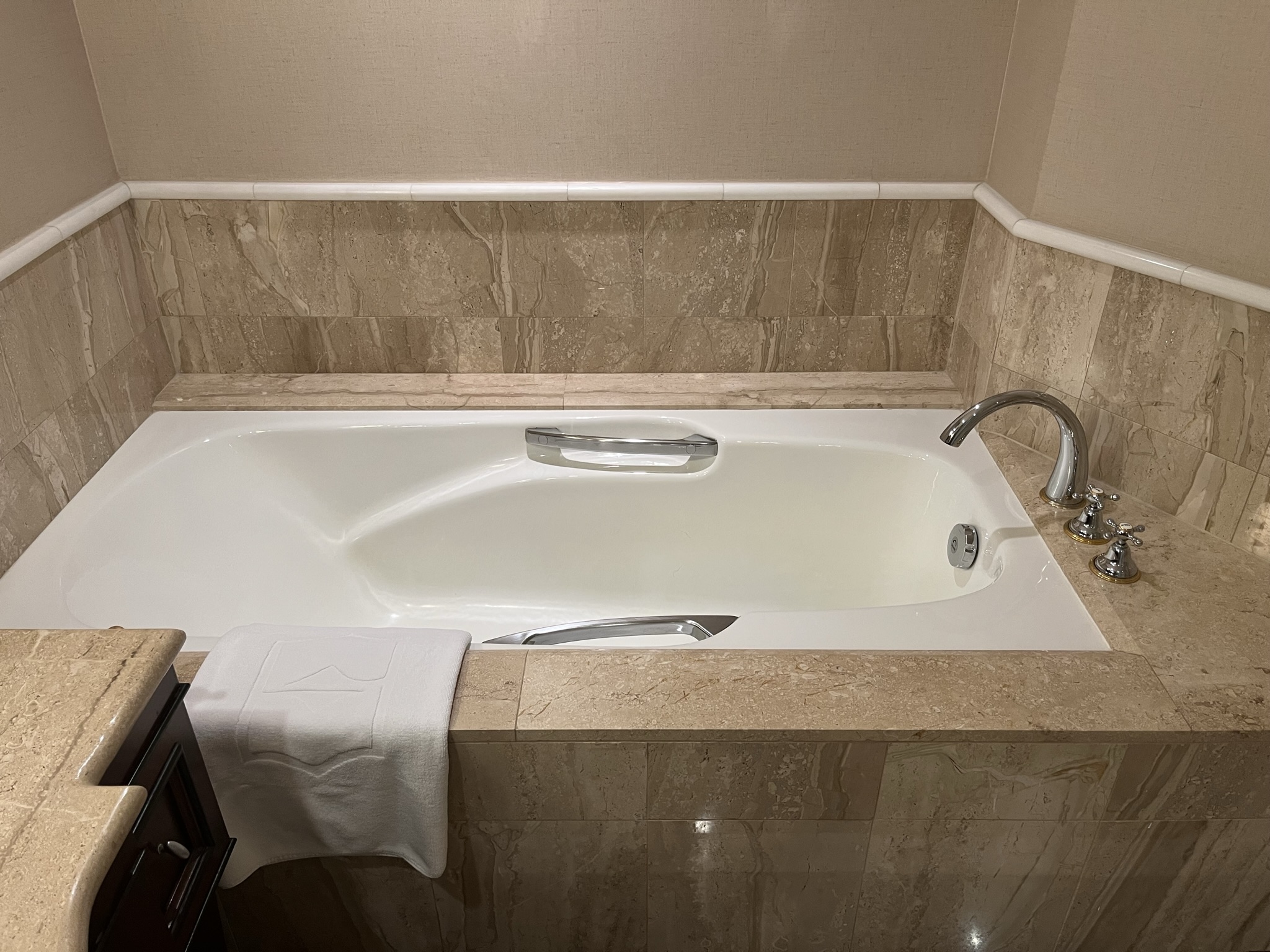 Das Bad war ebenfalls sehr geräumig und verfügte neben einem Waschbecken über eine Dusche und Badewanne. Das gesamte Bad war in Marmor gehalten. Größter Kritikpunkt: Die Dusche verfügte nur über einen einzigen schwenkbaren Duschkopf statt über eine Kombo aus Regenwalddusche und -Brause, die aus meiner Sicht die beste Lösung ist. Auch die getrennten Wasserhähne für kaltes und warmes Wasser machen das Duscherlebnis nicht besser.