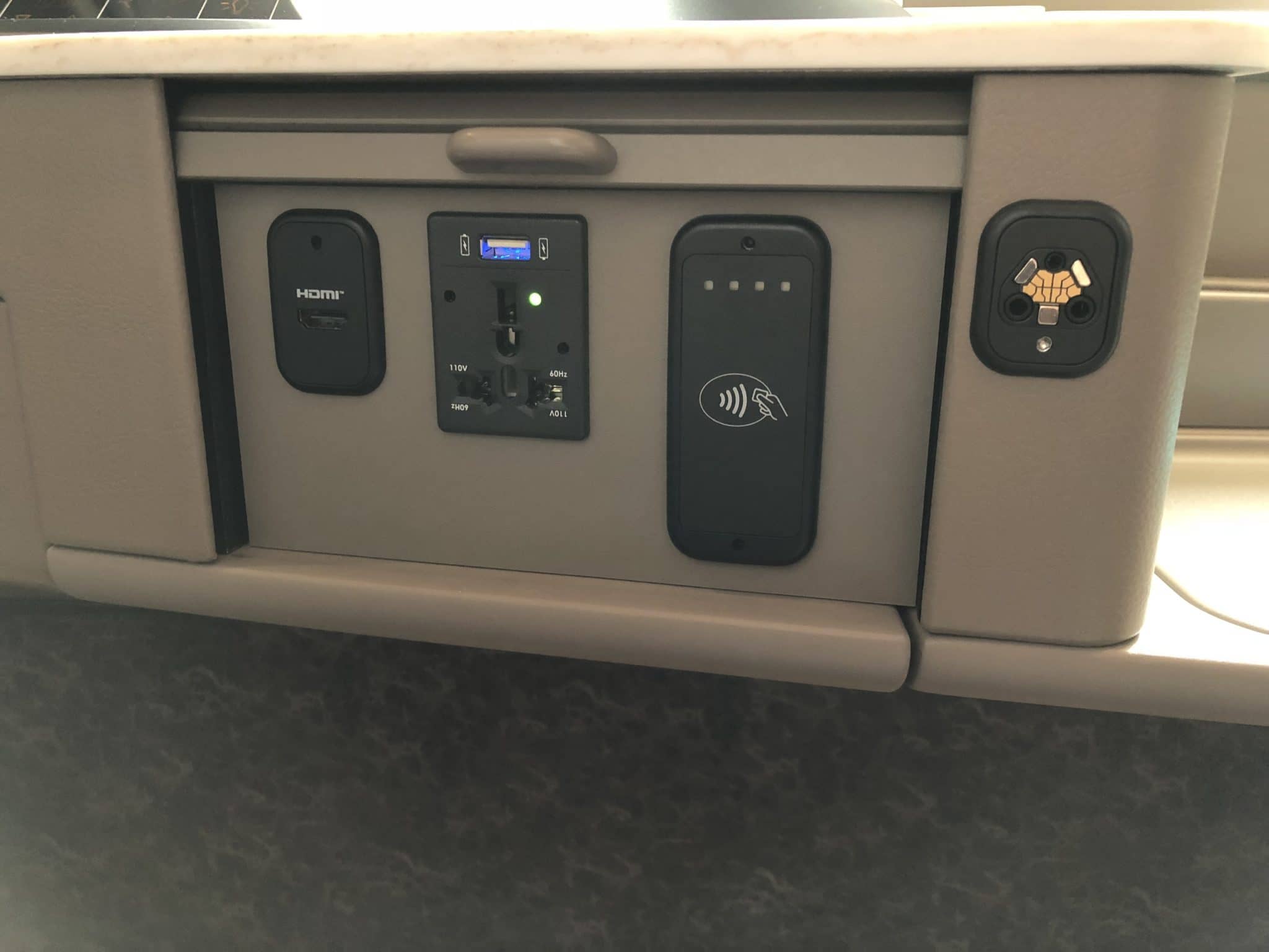 In der Armlehne befinden sich eine Fernbedienung, sowie die Optionen der unterschiedlichen Sitzeinstellungen. Seitlich vom Sitz, unter den drei Ablagefächern, findet ihr auch Anschlüsse für USB und Strom, sowie ein HDMI Anschluss. Eine zweite Steckdose und USB Anschluss befinden sich integriert in die kleine Kommode, wo auch euer Tisch verstaut wird. Oberhalb der Anschlüsse habt ihr noch Schalter um die Lichter in eurer Kabine zu steuern, oder den Service Button für euren persönlichen Steward.