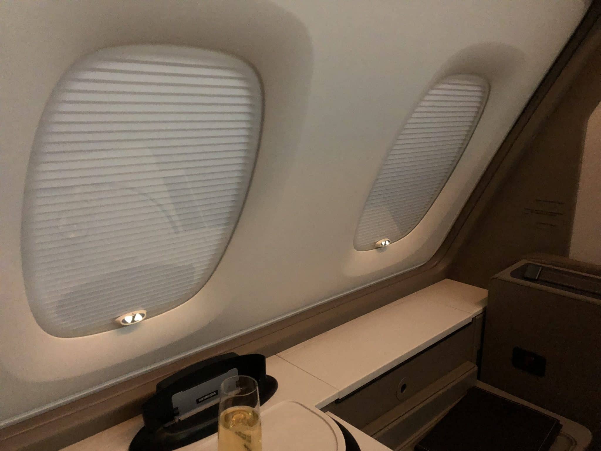 Was ich bis heute nicht verstehe ist, warum der Dreamliner bisher das einzige Flugzeug mit der Option zur Verdunklung der Scheiben ist. Ich finde das ist eine optimale Lösung und sollte eigentlich in jedem Flugzeug verbaut werden. In dem neuen A380 hat man zumindest in der Suite die Möglichkeit das Fenster leicht oder komplett zu verdunkeln.