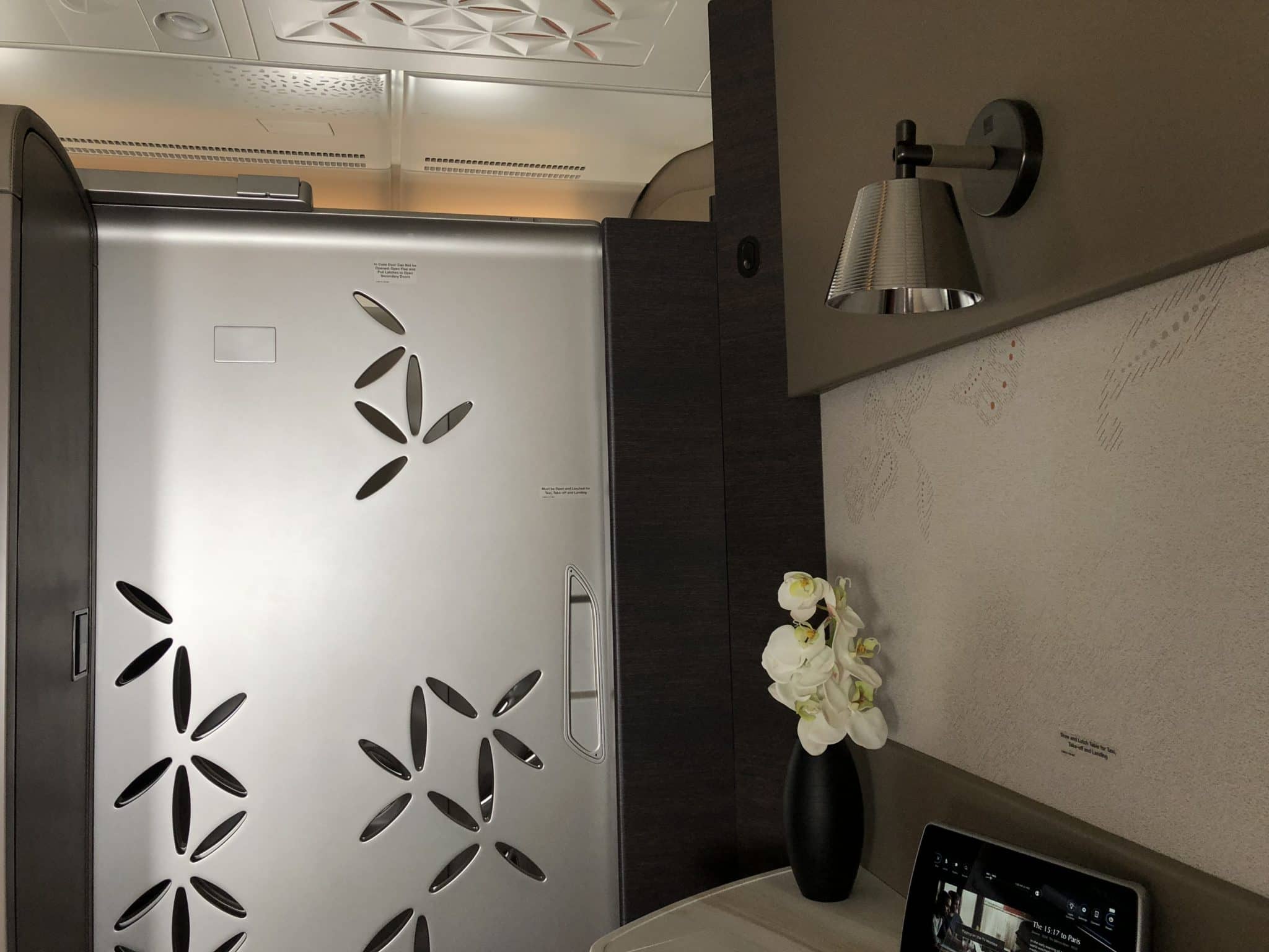 Wir hatten leider – oder zum Glück – keinen Slot bekommen, so dass wir ca. eine Stunde verspätet abgeflogen sind. Vorteil: Man bekommt noch mehr Champagner. Nachteil: Der Remote Controller ist die ganze Zeit fest in der Halterung verriegelt. Während Start und Landung muss die Tür der Kabine geöffnet sein, nur während des Fluges kann diese geschlossen werden. Es bieten sich allerdings kleine Schlitze für die Stewards zum durchgucken, um zu erkennen, ob abgeräumt werden kann oder ob der Gast noch irgendwelche Wünsche hat.
